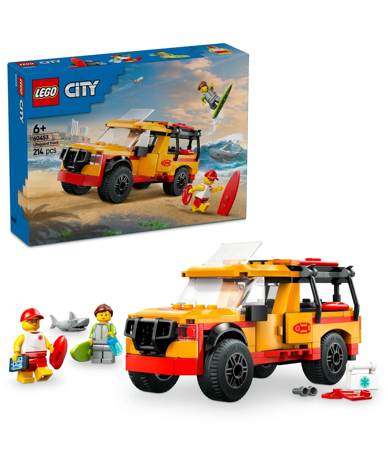 Beach rescue adventures are on the horizon with the LEGO® City Lifeguard Beach Rescue Truck playset (60453) for ages 6 and over. This cool truck toy with opening doors, tailgate and sunroof is packed with essentials for beach emergencies, including 2 surfboards, flippers, binoculars and a first-aid kit. The set also includes lifeguard and surfer minifigures and a shark figure for imaginative play and storytelling.