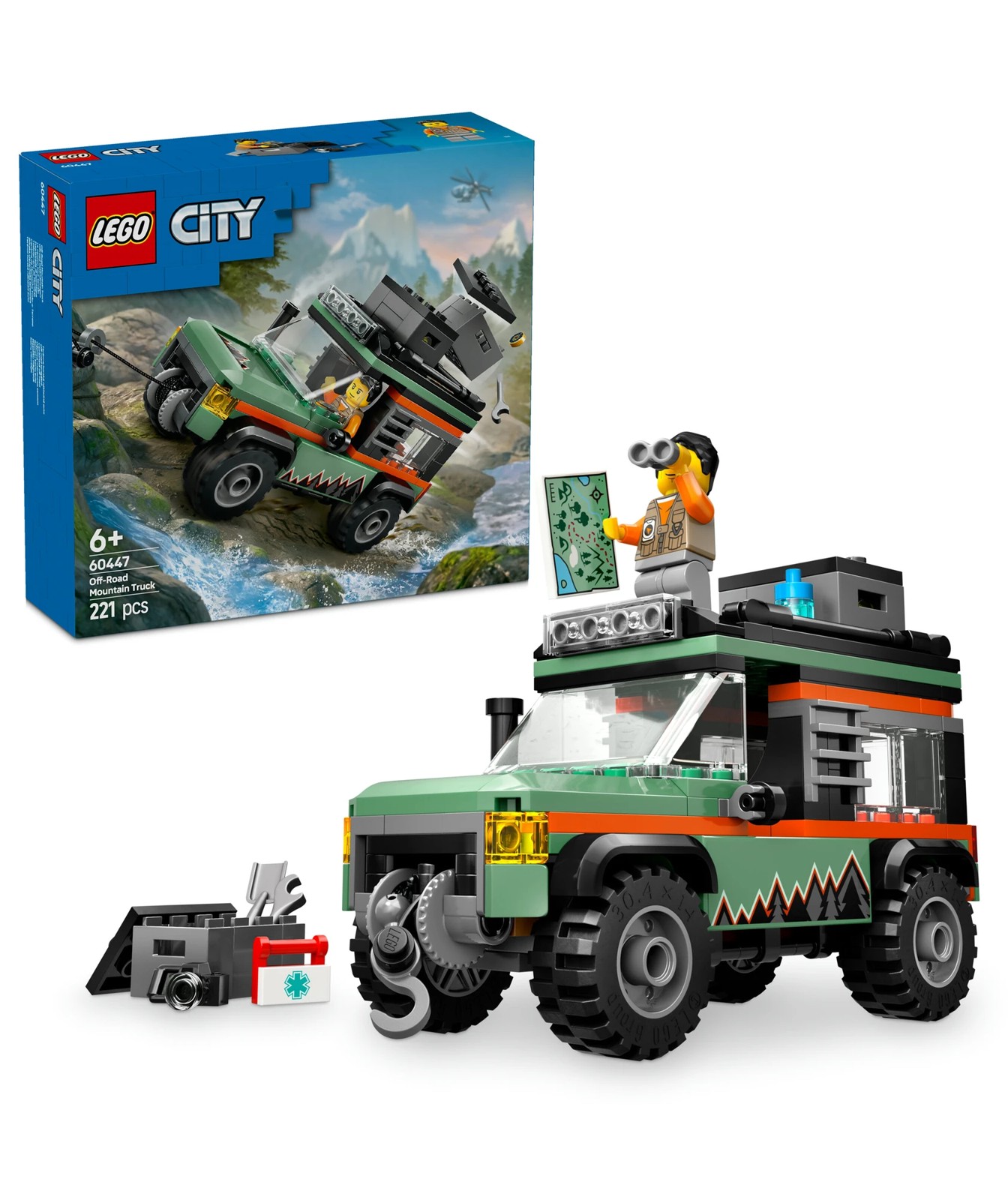 Kids can head for the hills with the LEGO® City Off-Road 4x4 Mountain Truck (60447) adventure toy for ages 6 and over. This tough truck is loaded with cool features and equipment for off-road exploration, including roof storage boxes, tools, rugged tyres and a working winch for tackling steep inclines. Flip the vehicle snorkel and up pops the bonnet for engine repairs! Just add the adventurer minifigure and let the play begin.