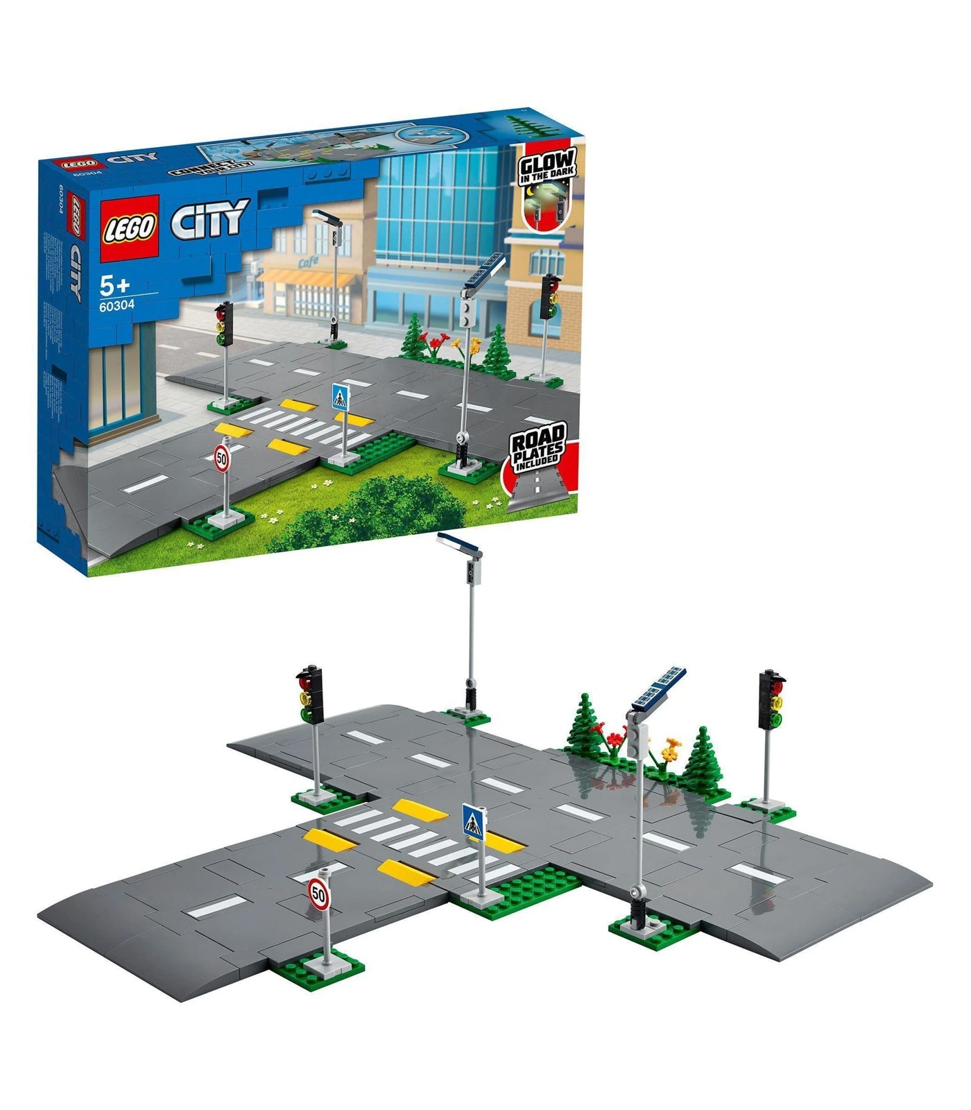 This LEGO® City Road Plates (60304) building set adds a realistic backdrop to kids’ imaginative play, with glow-in-the-dark toy streetlights, traffic lights, road signs, traffic lane markings, speed bumps, a pedestrian crossing, trees and greenery.