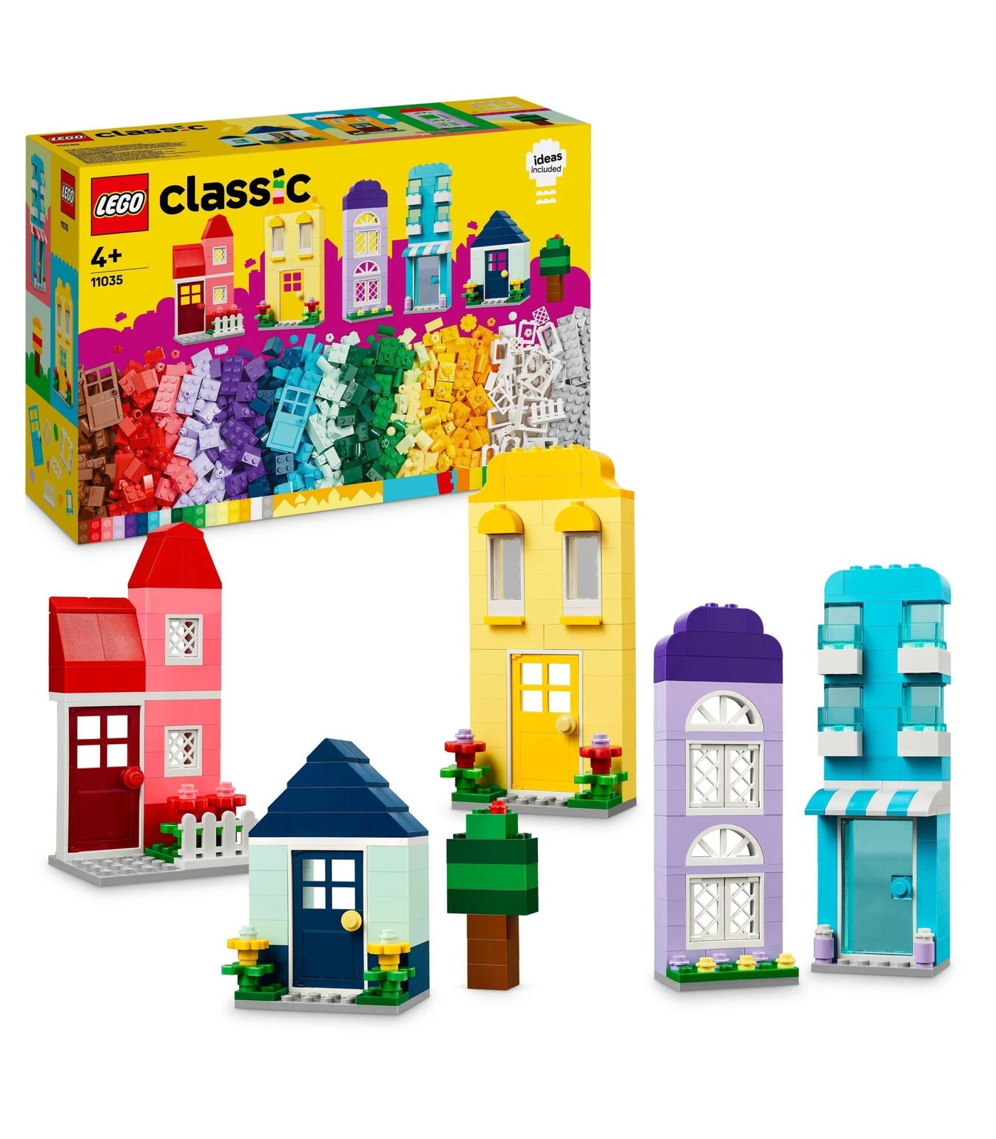 Inspire young builders with LEGO® Classic Creative Houses (11035). This build-your-own LEGO® houses toy is designed for ages 4+ and comes with 6 colourful houses to create, combine, and customise.