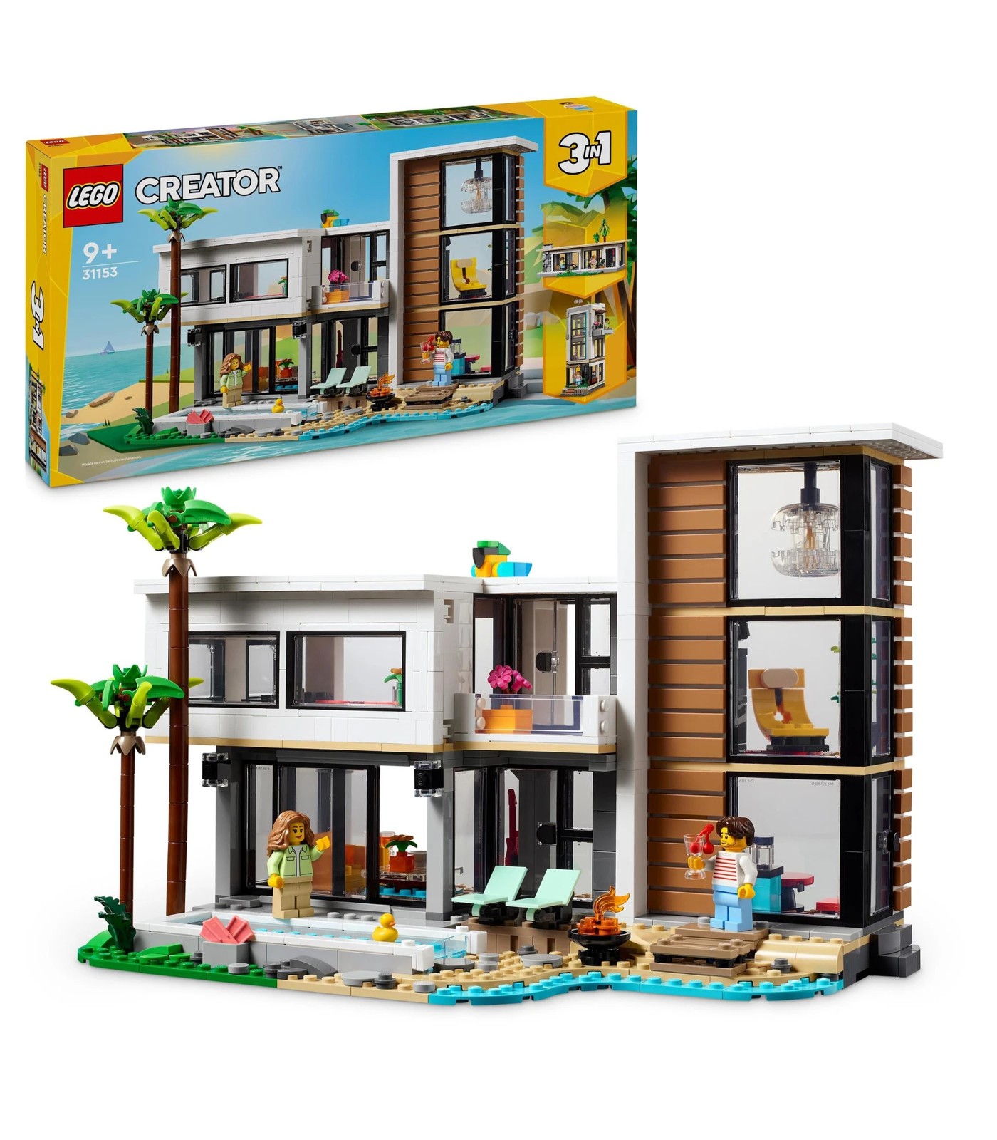 Boys and girls aged 9+ can explore 3 different LEGO® toy houses with this fun-filled Modern House (31153) playset. The luxurious 2-storey beach house sits in the shade of 2 palm trees and has a kitchen, living room, reading room, bedroom, shower room, balcony and modern furnishings including an armchair and chandelier. There is also a swimming pool for kids to role-play fun stories.