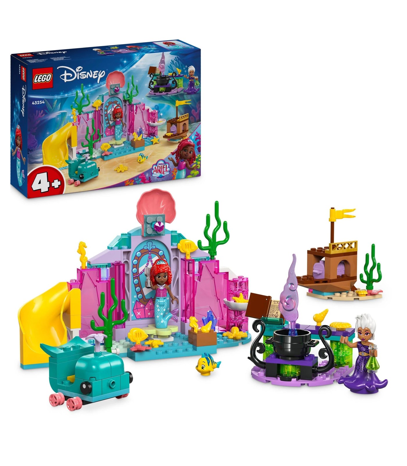 Exploration and play await kids aged 4+ as they learn to build with this LEGO® ǀ Disney Princess Ariel’s Crystal Cavern (43254) building toy. This buildable mermaid playset gift helps boost kids’ problem-solving skills with creative play. Inside is a cavern with a spinning platform and slide, a whale vehicle, a shipwreck with a treasure chest and a cauldron. It also includes Ursula and Ariel LEGO ǀ Disney mini-doll figures and a Flounder LEGO ǀ Disney fish figure.