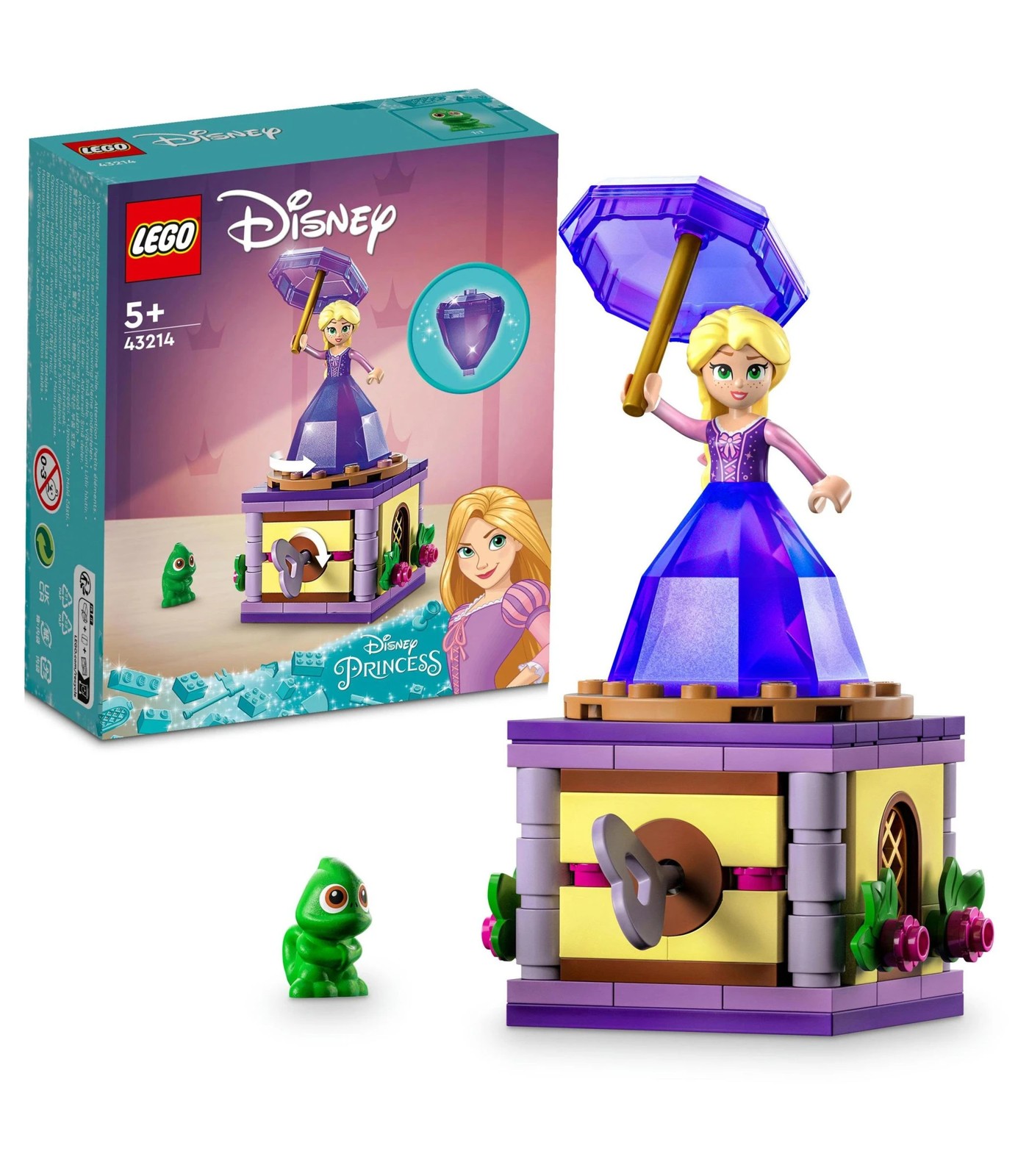 Captivate kids aged 5 and over with this LEGO® ǀ Disney Twirling Rapunzel (43214) set, featuring a buildable stand with decorative details, key and space for Pascal the chameleon LEGO figure, a Rapunzel LEGO mini-doll figure and a ‘diamond’ dress that connects with the umbrella to store the mini-doll. Kids can enjoy an easy and intuitive building adventure with the LEGO Builder app, which lets them zoom in and rotate models in 3D, save sets and track their progress. Learning and fun Disney’sRapunzel fans gain meaningful skills while playing with this set. The build helps grow children’s confidence, while sparking their imagination and creativity as they play out film-based scenes or invent their own. It can be played with independently or added to other LEGO ǀ Disney sets (sold separately). Well-known characters This fun set gets kids playing quickly with a Disney’s Rapunzel LEGO mini-doll figure and Pascal LEGO chameleon figure and makes a creative ‘just because’ gift for kids any time.