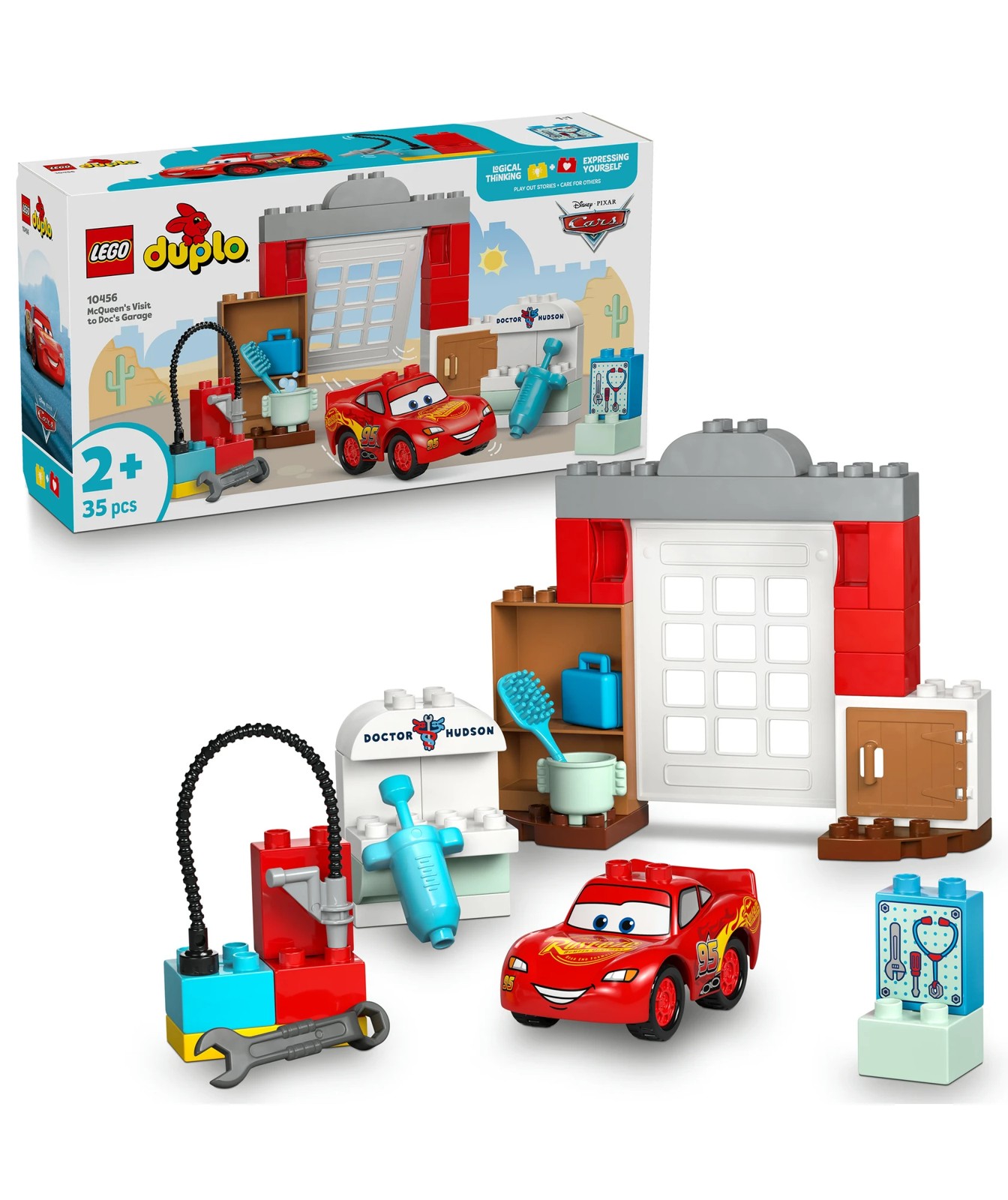 Let preschoolers care for their favorite buildable race car toy with LEGO® DUPLO® │ Disney and Pixar Cars McQueen’s Visit to Doc’s Garage (10456) buildable toddler toy. This building set transports preschoolers to the world of the Disney and Pixar Cars movies, while helping them develop caring skills through creative play.