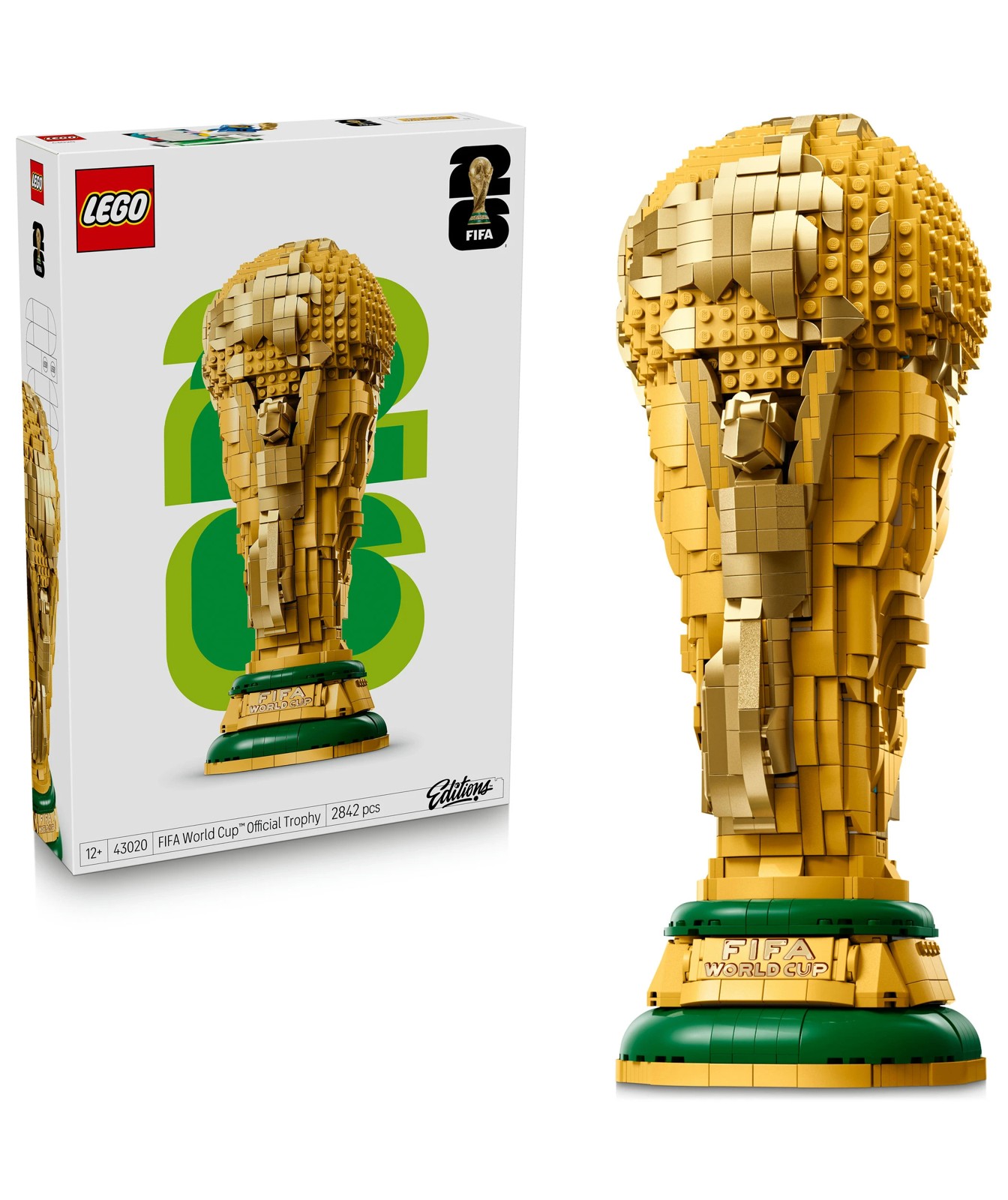 Become a creative champion with the LEGO® Editions FIFA World Cup™ Official Trophy (43020) building set for football fans aged 12 and over. Sports stars aged 12 and over will have lots of fun building this World Cup™ Trophy replica from LEGO bricks and discovering its authentic details. It features 2 human figures in a swirling movement holding up the Earth, the iconic globe and a plaque at the bottom naming past World Cup winners. The top globe of the LEGO trophy opens to reveal a FIFA World Cup 2026™ branded minifigure holding a mini trophy toy and a backdrop that shows the 2026 World Cup™ logo. The small scene can be kept inside the trophy or taken out to be displayed next to it. Once complete, the trophy makes awesome football decor and is a great birthday or anytime gift idea for boys, girls and sports fans of all ages. It’s also available digitally in the LEGO Builder app, where kids can track their progress and rotate their builds. Set contains 2,842 pieces.