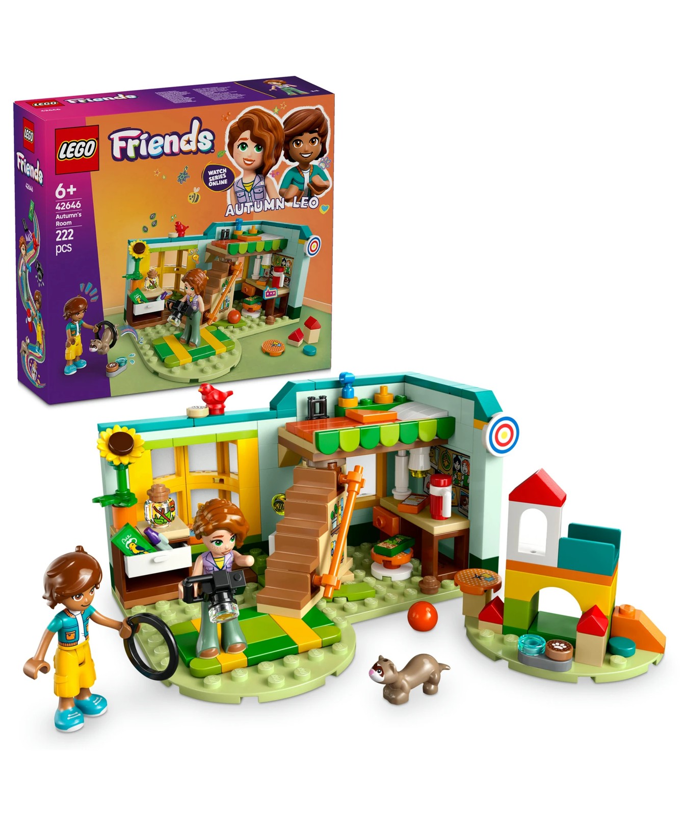 This kids’ pretend-play set for boys and girls aged 6 years old and over reveals a world of friendship stories for young nature-lovers. The LEGO® Friends Autumn’s Room nature playset (42646) features a buildable room scene, playground build, Autumn and Leo minidolls, a ferret figure and a bird figure.
