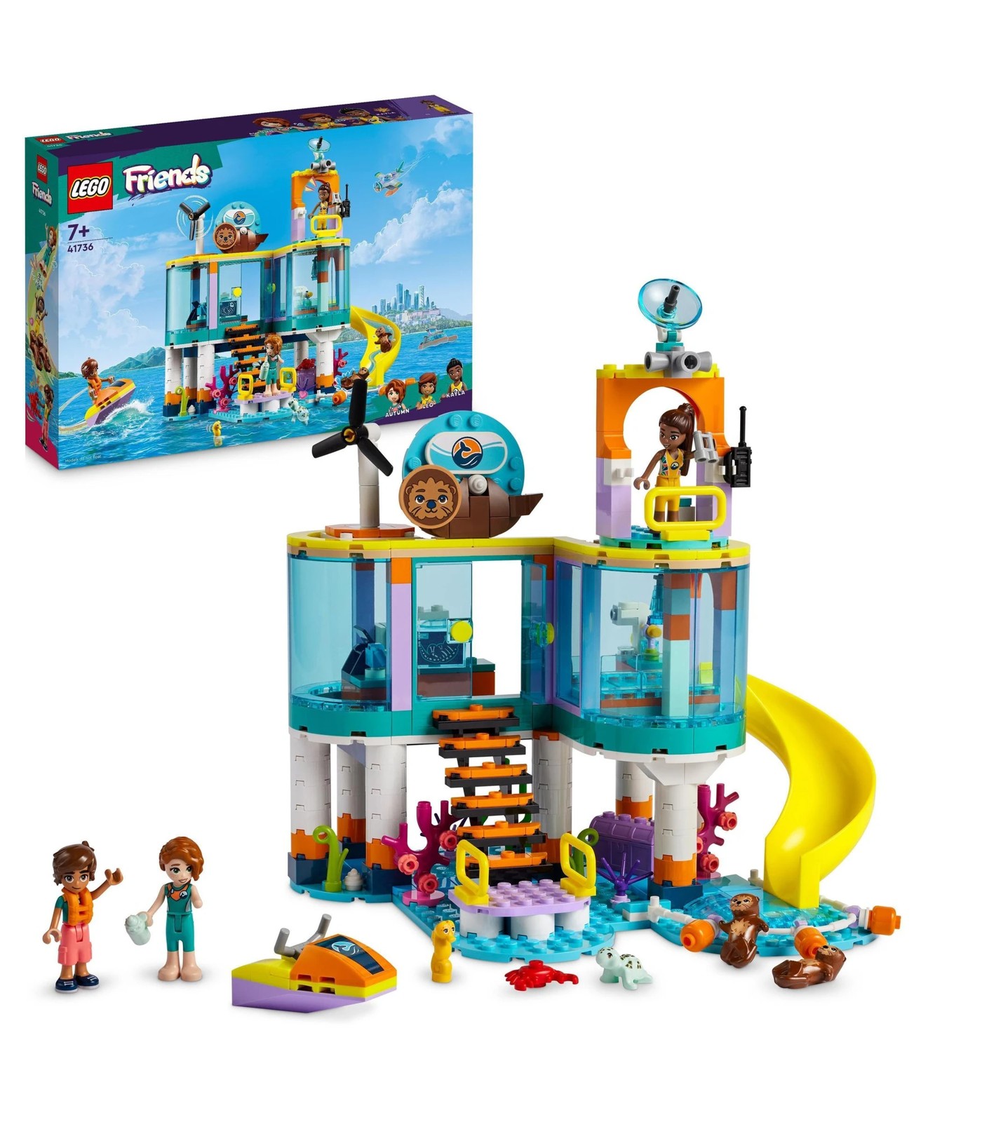 Kids ages 7 and over who love animals can act out ocean stories with this LEGO® Friends Sea Rescue Centre (41736) toy. The set comes with 3 mini-dolls and 2 sea otters, a seahorse and a sea turtle, plus lots of accessories to inspire pretend play. Kids can use the water scooter to pull up to the dock, then head inside to clean, X-ray and feed the otters. Then they can help the otters slide into the rehabilitation area. When the otters are well again, they can swim back into the ocean. Accessories include a life jacket, feeding bottle, walkie-talkie, treasure chest, camera, computer, microscope, syringe and an X-ray machine.