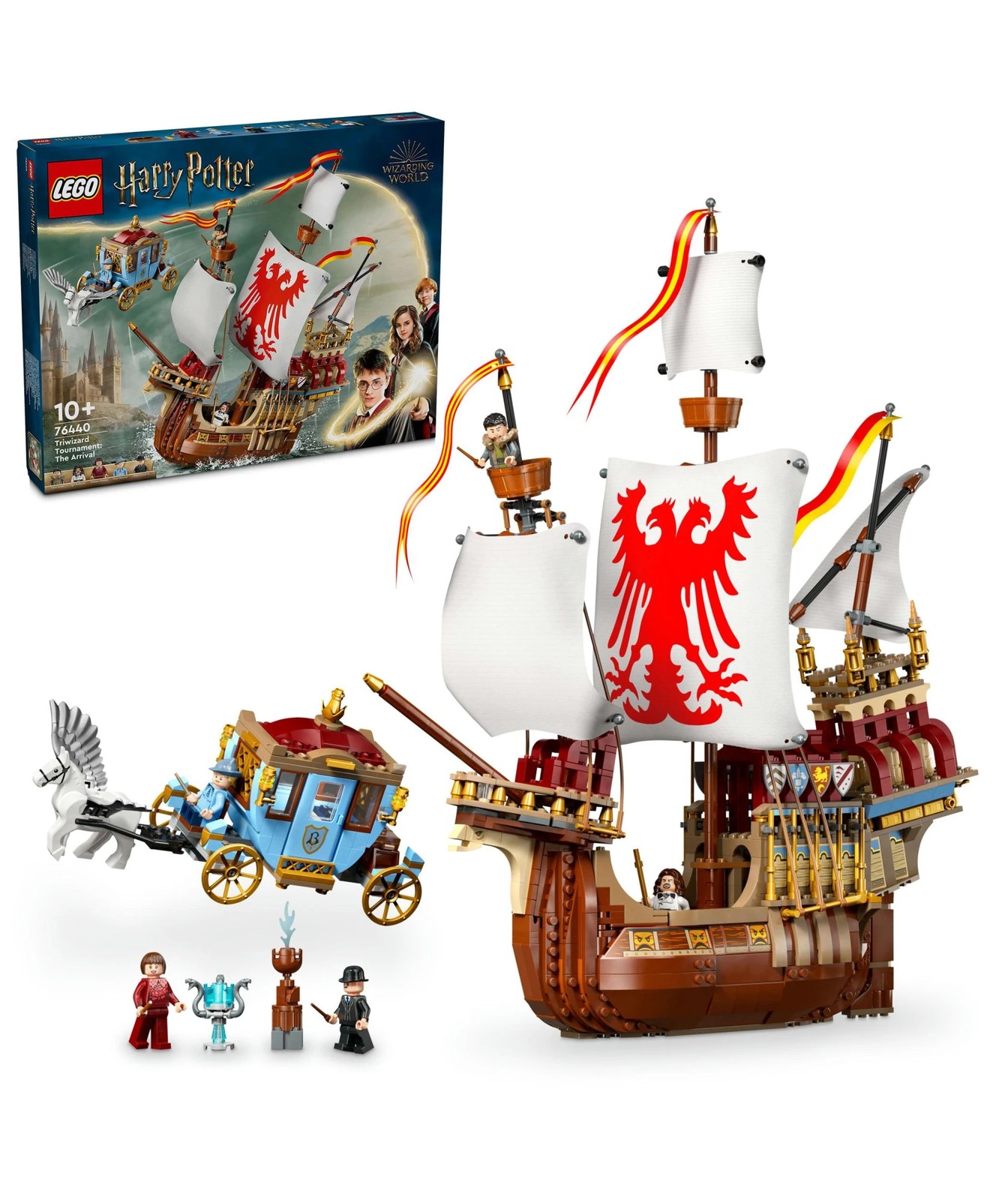 Recreate an iconic scene with this LEGO® Harry Potter™ Triwizard Tournament: The Arrival (76440) ship playset for kids. A magical toy gift set for boys, girls and any Harry Potter fan aged 10+, it features detailed models of the Durmstrang Ship and Beauxbatons Carriage to play out the competitors’ arrivals at Hogwarts™ for the tournament. The ship has a living area and sleeping quarters below deck for minifigures. The ‘flying’ carriage is led by a beautiful Abraxan figure and has room inside for 2 minifigures with a trunk at the back.