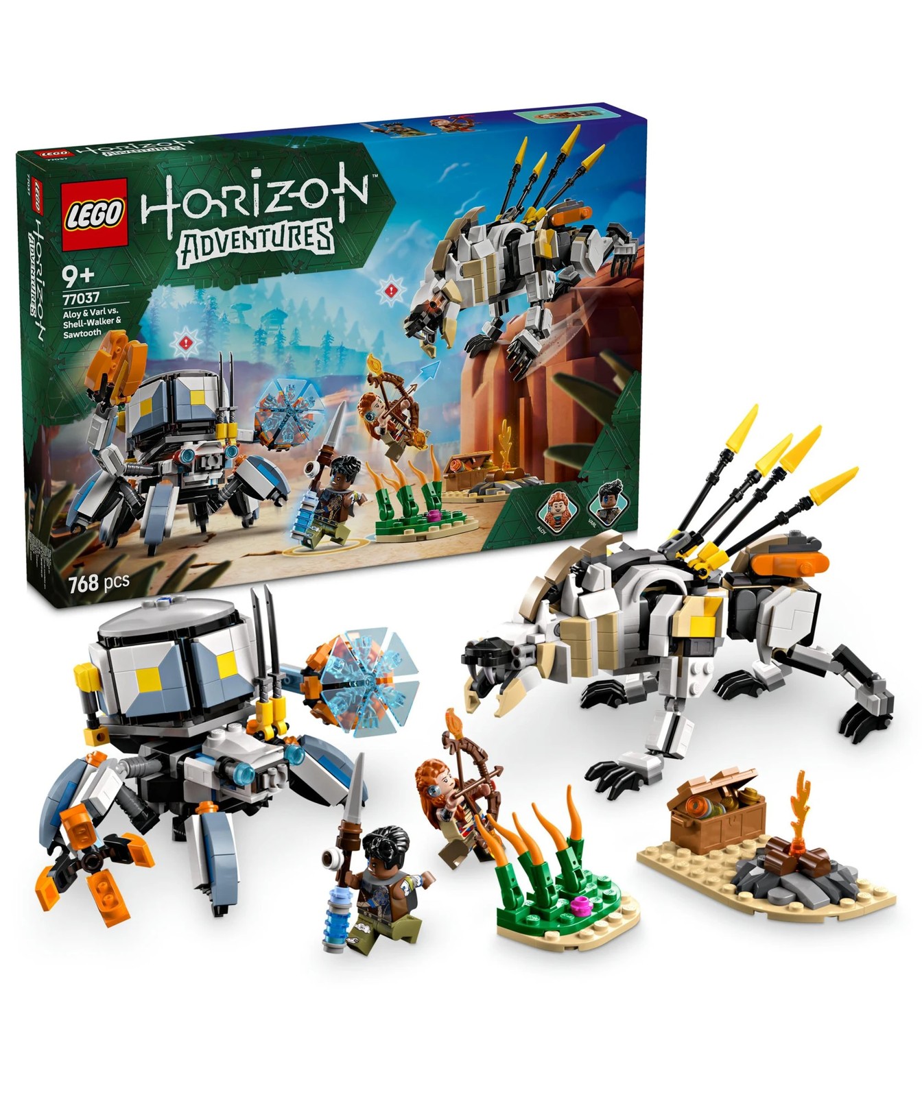 LEGO® Horizon Adventures™ Aloy & Varl vs. Shell-Walker & Sawtooth (77037) is a collectible fantasy gaming toy for kids aged 9 and up.
