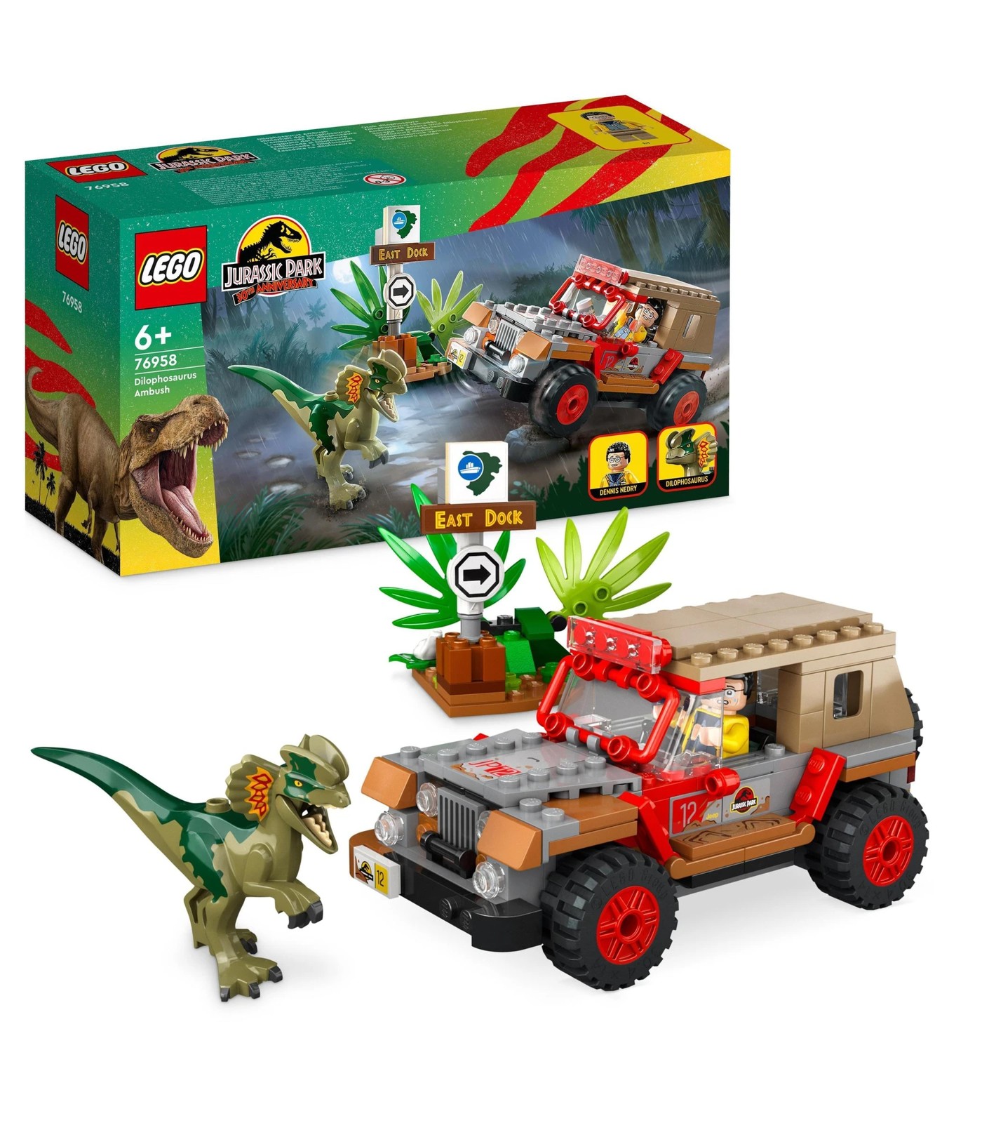 Youngsters can recreate a classic Jurassic Park scene and play out their own stories with this collectible LEGO® Jurassic World Dilophosaurus Ambush (76958) toy building set. A cool gift for kids aged 6 and over, it features a dilophosaurus figure and a buildable Jurassic Park Jeep® toy with a driving seat for the Dennis Nedry minifigure, plus muddy minifigure and dinosaur footprint decoration. There is also a small jungle build, including an ‘East Dock’ sign for the Jeep to knock over like in the film and a Barbasol can element to inspire imaginative play.