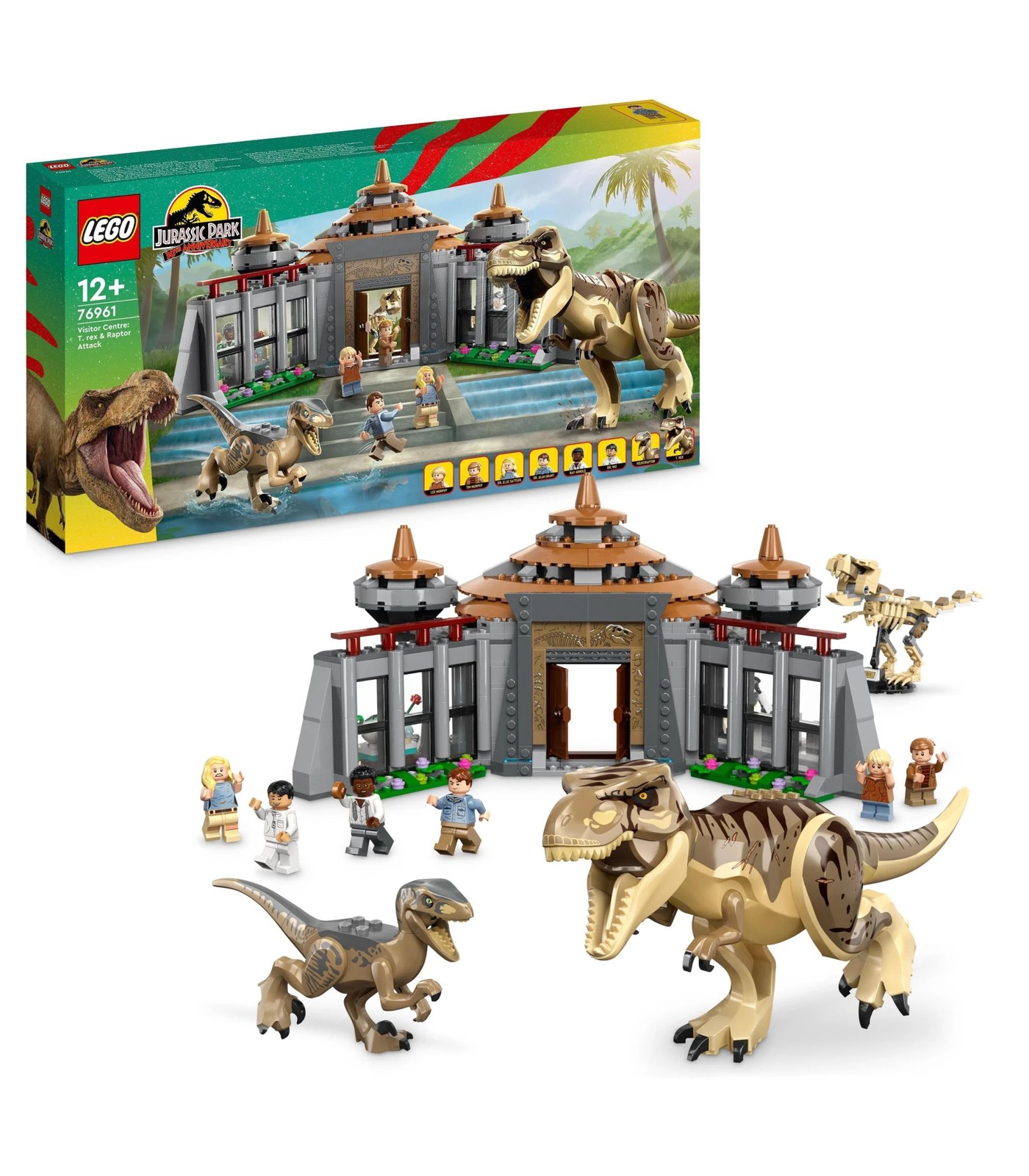Relive dramatic Jurassic Park scenes with this collectible LEGO® brick-built Visitor Centre: T. rex & Raptor Attack (76961) play-and-display set for ages 12 and over. The Visitor Centre’s distinctive architecture is captured in LEGO style, and the entrance hall, kitchen/dining area and lab are divided by semi-transparent screens with dinosaur graphics. Place the buildable T. rex skeleton in the entrance hall and make the ‘When dinosaurs ruled the Earth’ banner fall down at the flick of a triggerduring battles between the posable T. rex and velociraptor toy figures.