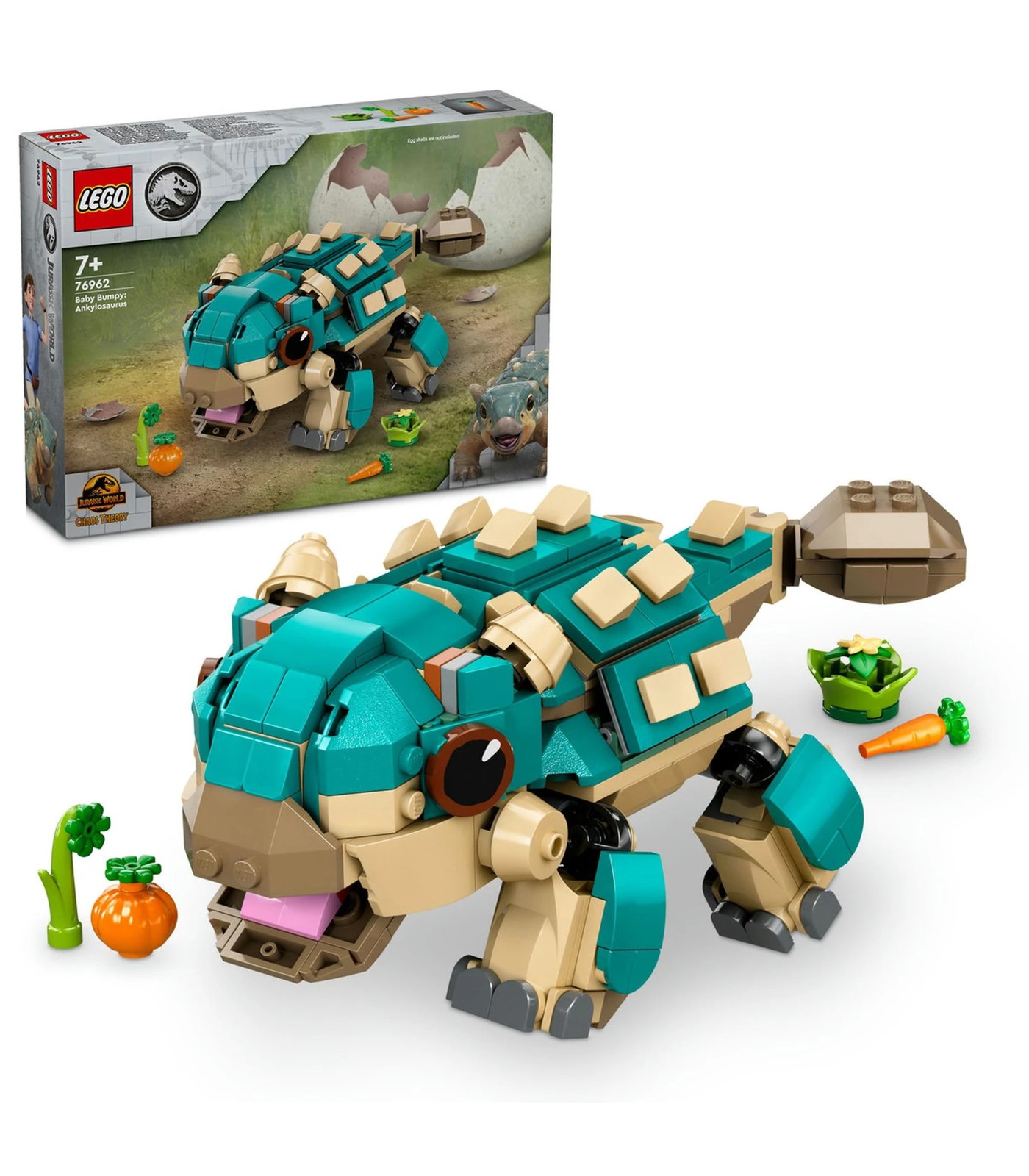Inspire fans of the Camp Cretaceous TV show with a Baby Bumpy: Ankylosaurus dinosaur toy (76962) model full of play-and-display adventure possibilities. First, young dinosaur tenders aged 7+ build this LEGO® Jurassic World set, then they dive into play as they start exploring the world with Bumpy. The build-a-dinosaur adventure set figure includes an opening jaw, articulated tail that waggles when the head moves from side to side, articulated legs and some vegetables. Once play is over, display the fun dinosaur gift in different dynamic poses on a shelf or table.
