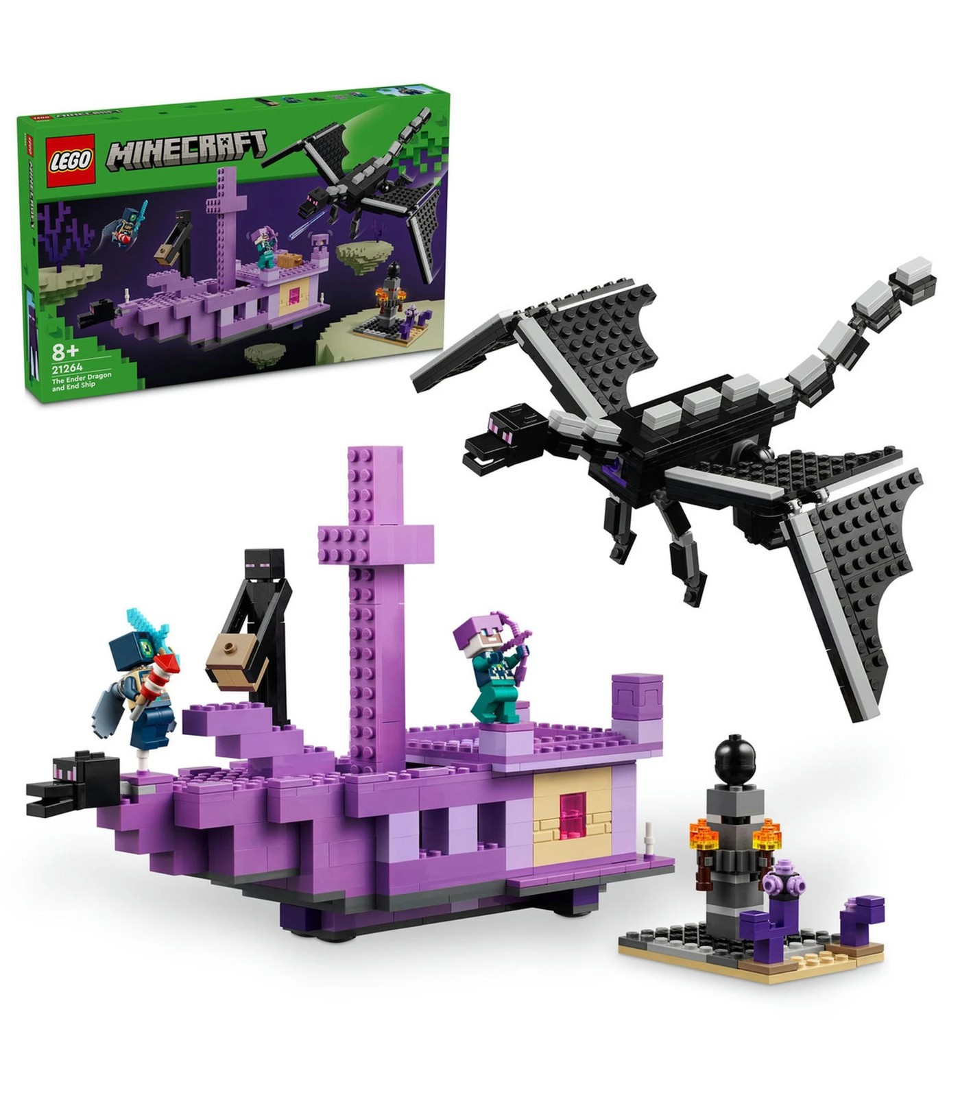 The Ender Dragon and End Ship (21264) playset is a video-game building toy for kids that is packed with popular Minecraft® characters, dragon action and adventures aboard a ship. It’s an ideal Minecraft dragon gift for kids aged 8 and up who enjoy building-brick explorer toys. Players enter the perilous End biome, where they must battle the Ender Dragon. All the limbs of this fully-jointed Minecraft model are movable and adjustable. The End Ship has a fully equipped interior, accessed via a lift-off roof and opening sides. A dragon’s head at the ship’s bow can be removed and worn as a helmet. Inside, kids will find a brewing stand with health potions. Minecraft characters include an Ender Explorer with elytra wings and firework rocket, an Ender Knight, a Shulker and an Enderman. Accessories include the prized dragon’s egg. For added digital fun, builders can zoom in, rotate models in 3D and track their progress using the fun, intuitive LEGO® Builder app.