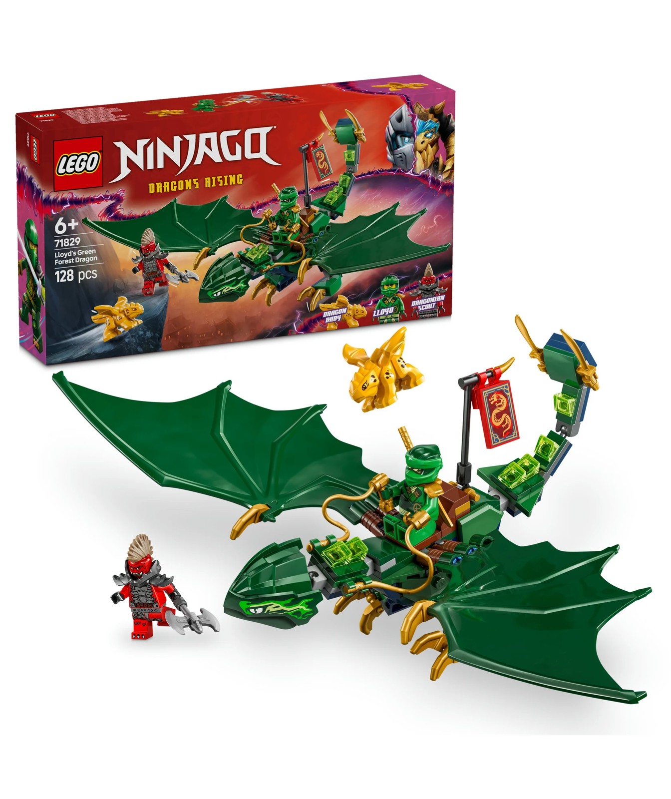 This LEGO® NINJAGO dragon set also comes with 2 minifigures: Lloyd armed with a golden katana sword accessory and a villainous Dragonian Scout warrior with an axe accessory, plus a golden Dragon Baby model so kids can enjoy exciting and nurturing role play.