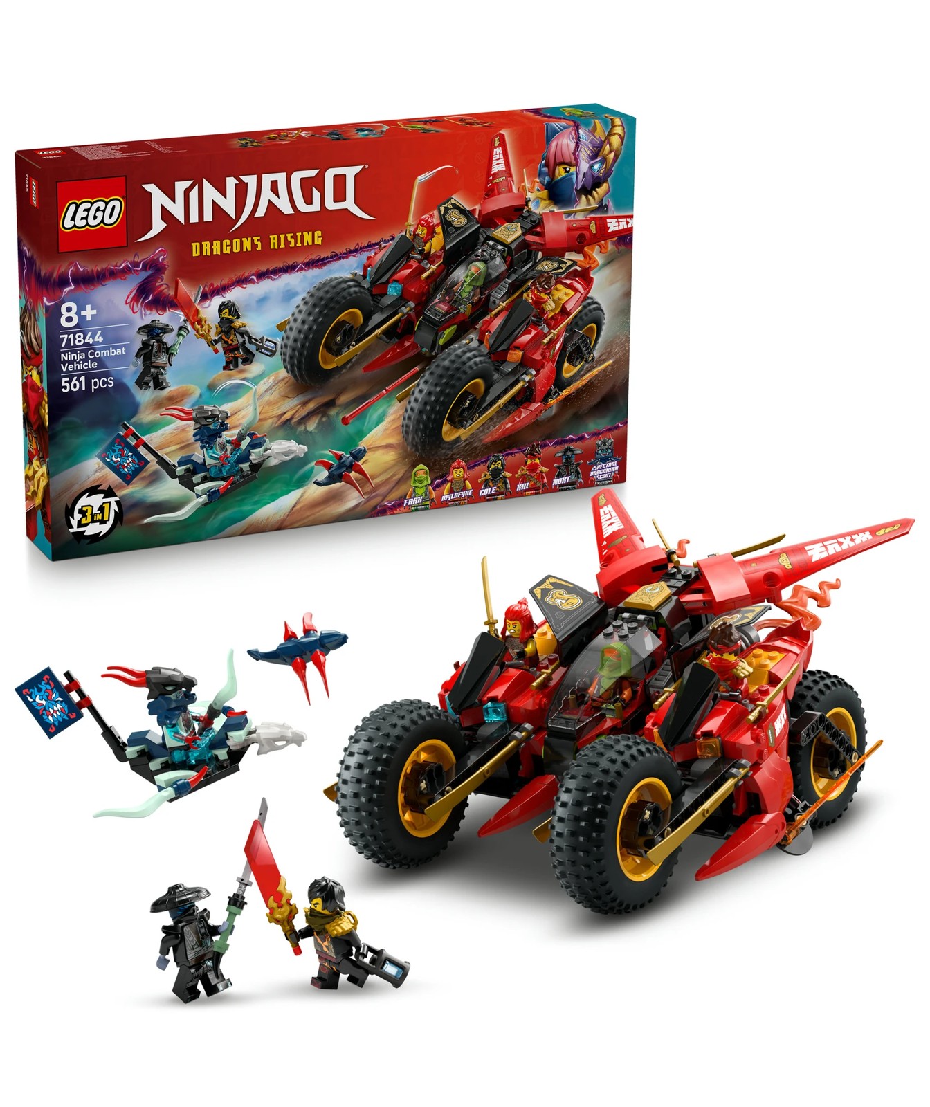 Kids aged 8 plus enact scenes from season 3 of the NINJAGO® Dragons Rising TV show with the Ninja Combat Vehicle 3-in-1 action toy (71844). Kids can play with a large ninja bike action toy before separating it into 3 smaller vehicles: Kai’s bike, Wyldfyre’s bike and Frak’s aircraft jet toy with 2 stud shooters.