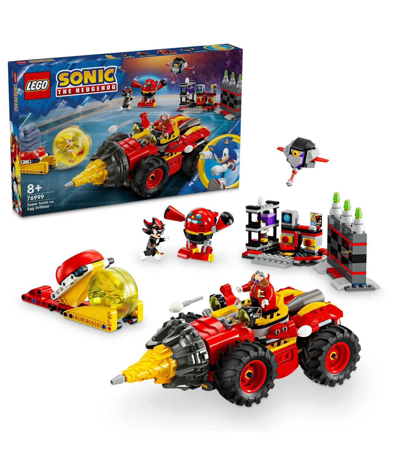 Supercharge the imaginations of video game fans aged 8+ with a Super Sonic vs. Egg Drillster (76999) building and adventure hero playset. This collectible LEGO® Sonic the Hedgehog™ video game toy gift features an Egg Drillster vehicle with a rotating drill bit and a dock for the detachable hover vehicle, a speed sphere launcher and speed sphere, plus a lab with a breaking wall. It also includes 7 video game toy characters: Shadow, Super Sonic, Dr. Eggman, a Pocky, a Pecky, an Egg Pawn Badnik and a ‘reprogrammed’ Gun Wing.