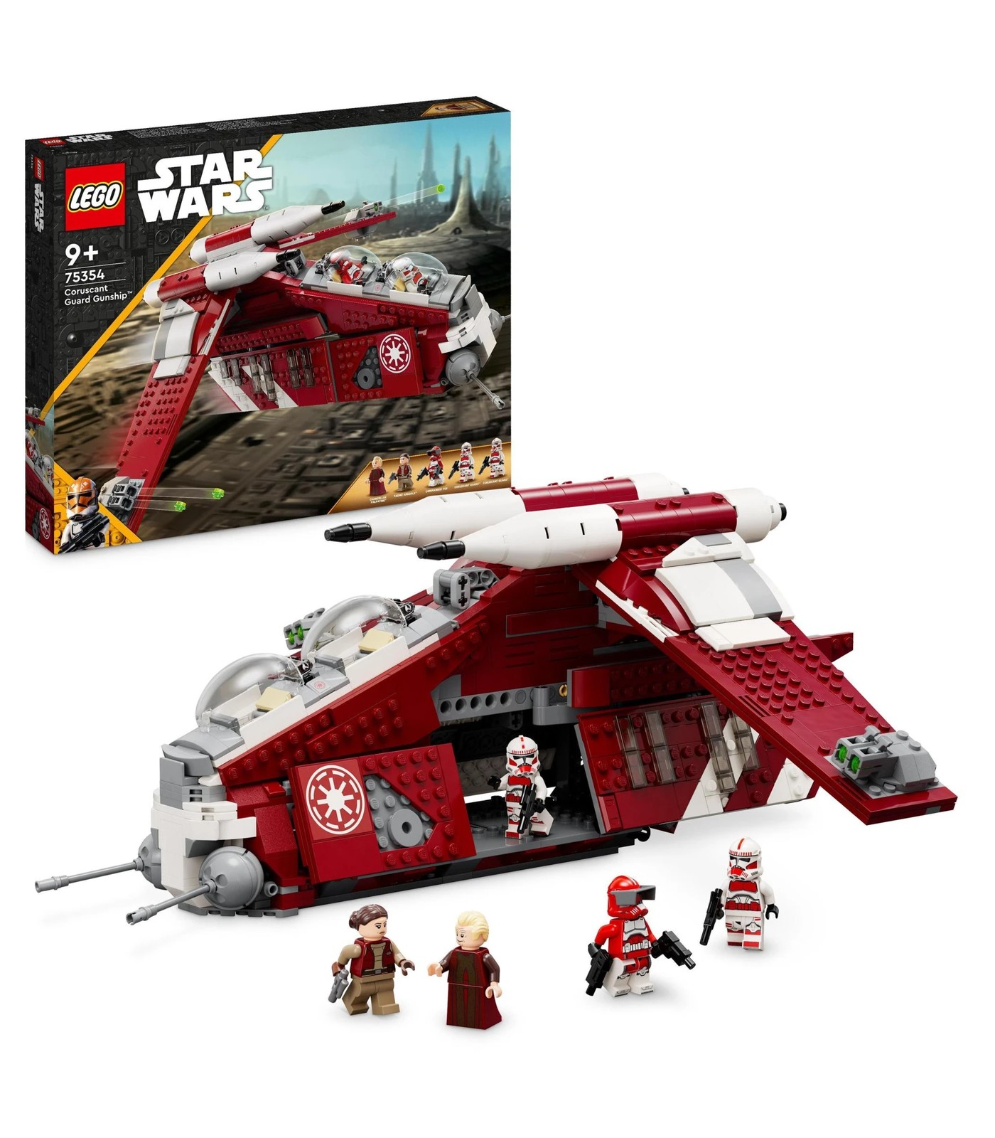 Fans can take command of their own Star Wars: The Clone Wars missions with this LEGO® brick Coruscant Guard Gunship (75354). It features 2 pilot cockpits, 2 stud shooters, 2 adjustable cannons and a handle for flying. The rear hatch and sliding side panel give easy access to the cabin where there is space for troopers. A top Star Wars™ gift idea for kids aged 9 and over, the set also includes 5 LEGO minifigures, including Commander Fox, Chancellor Palpatine and Padmé Amidala, plus 3 blaster pistols and 2 blasters for action play.