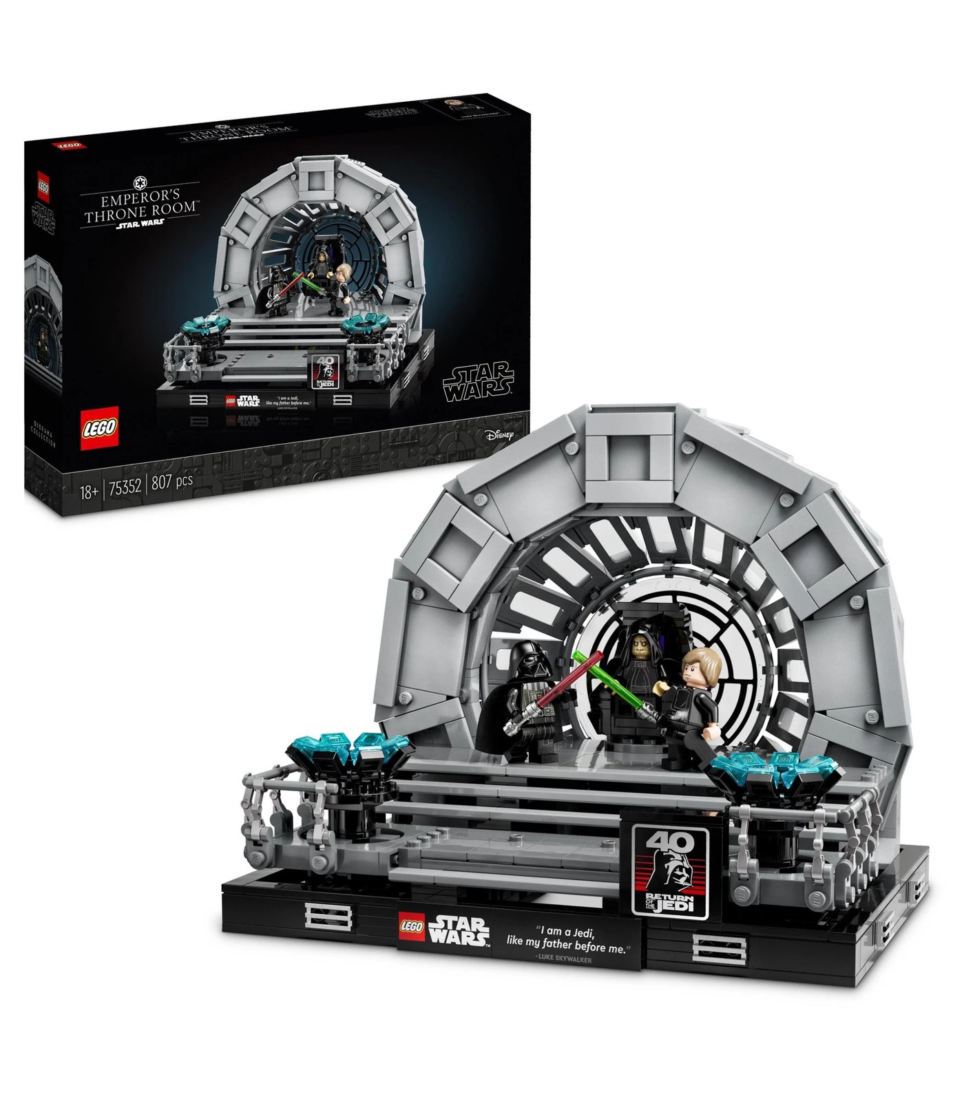 It is packed with authentic details, including a Death Star window element designed especially for this set and Emperor Palpatine’s rotating throne. Capture the action with Darth Vader and Luke Skywalker LEGO® minifigures, each with lightsabers, and Emperor Palpatine with 2 Sith lightning bolt elements. This build-and-display model is completed with a plaque featuring a famous Luke line(“I am a Jedi, like my father before me.”) and a plaque with the Star Wars: Return of the Jedi 40th anniversary logo. Galaxy of joy This is part of a collection of LEGO Star Wars Sets for Adults, including other buildable dioramas depicting iconic scenes, and is a great gift for yourself and other adult Star Wars fans. LEGO Builder With the LEGO Builder app, it’s easy to keep your instructions organised and at hand. Use the app to zoom in and rotate models in 3D, save sets and track yourprogress.