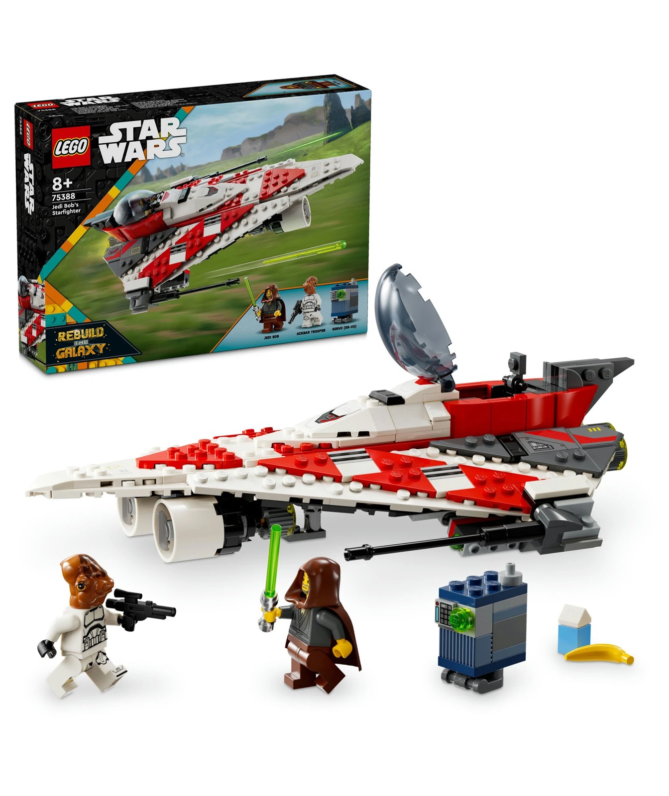 Introduce kids to the mystery character from a 2002 LEGO® Star Wars™ set who became a fan favourite with Jedi Bob’s Starfighter (75388). A cool birthday gift idea for boys, girls and any fan aged 8 and over, this LEGO Star Wars buildable toy set features a starfighter with an opening cockpit, 2 spring-loaded shooters and retractable landing gear. Play out exciting adventures with 2 LEGO Star Wars minifigures: Jedi Bob and an Ackbar Trooper, plus a Servo (SR-V0) LEGO droid figure, as seen in the LEGO Star Wars: Rebuild the Galaxy Disney+ special. Accessories such as Jedi Bob’s lightsaber, which clips to the base of the brick-built starship toy, and a blue milk carton and banana element, which can both be stowed in the storage compartment, add to the fun.