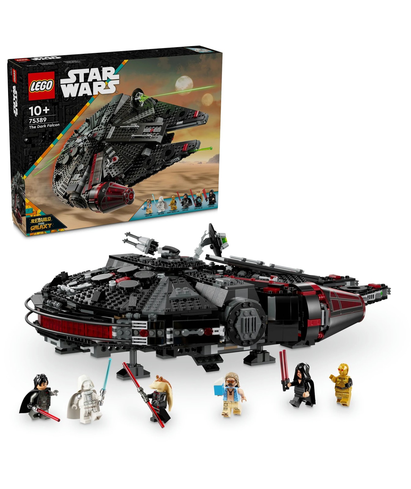 Turn the LEGO® Star Wars™ universe upside down with The Dark Falcon buildable toy vehicle set for kids (75389), which features a dark version of the Millennium Falcon, as seen in the LEGO Star Wars: Rebuild the Galaxy Disney+ special. A thrilling birthday gift for boys, girls and any fans aged 10 and over, this LEGO Star Wars brick-built starship toy has flip-up panels for easy access to the detailed interior, including Darth Jar Jar’s throne, the command centre, hyperdrive, entertainment area and jail cell. Spring-loaded shooters, rotating cannons and a removable gunner post add to the action-play possibilities.