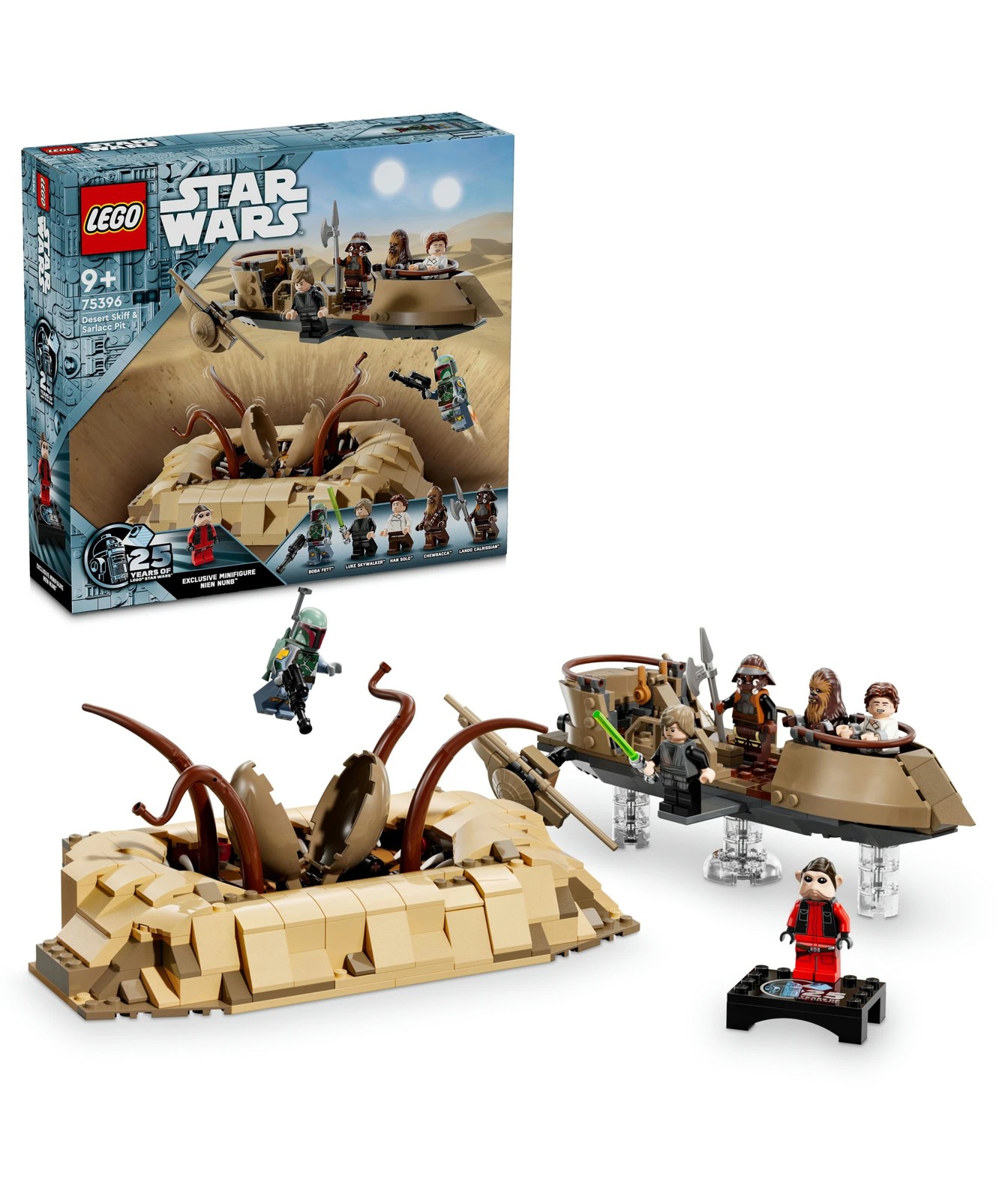 Replay a thrilling Star Wars: Return of the Jedi scene and create new adventure stories with this LEGO® brick-built Desert Skiff & Sarlacc Pit toy vehicle playset (75396) for kids aged 9 and over. The desert skiff features translucent elements for a hover effect and has playful details such as a push-out plank for Luke Skywalker to walk and the foldout railing where Han Solo nearly fell off. The pit has levers to move the Sarlacc’s tentacles, and the Sarlacc has space in its mouth for a LEGO minifigure.
