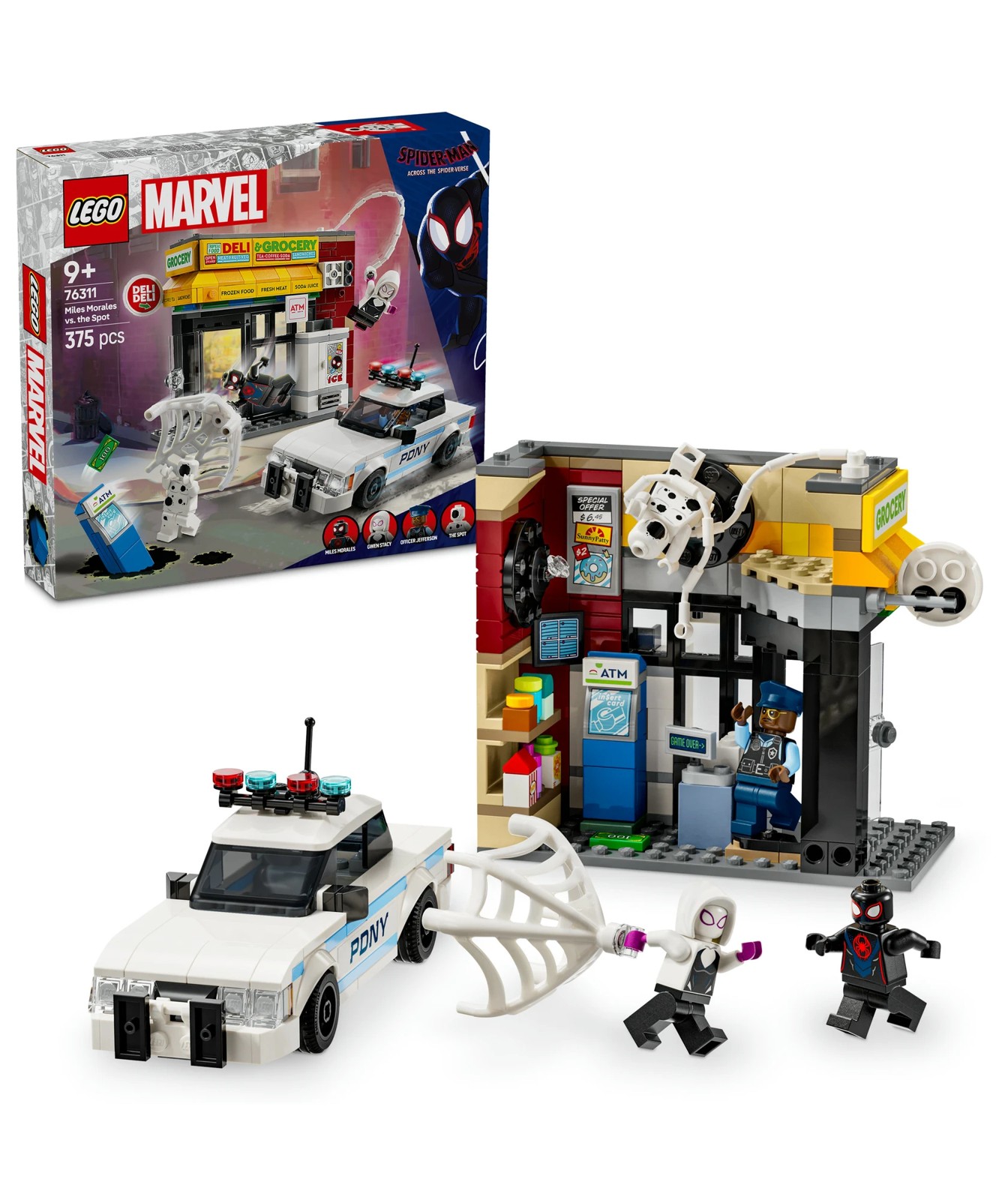 The Spider-Man playset comes with 4 minifigures: Miles Morales, The Spot, Gwen Stacy and Officer Jefferson. The shop has an exploding-wall feature that allows the cash machine to be removed. Accessories include a long, flexible web rope and a flexible web that is large enough to encase a minifigure. The police car opens to allow 2 minifigures to be placed inside. For added digital fun, builders can zoom in, rotate models in 3D and track their progress using the fun, intuitive LEGO Builder app.