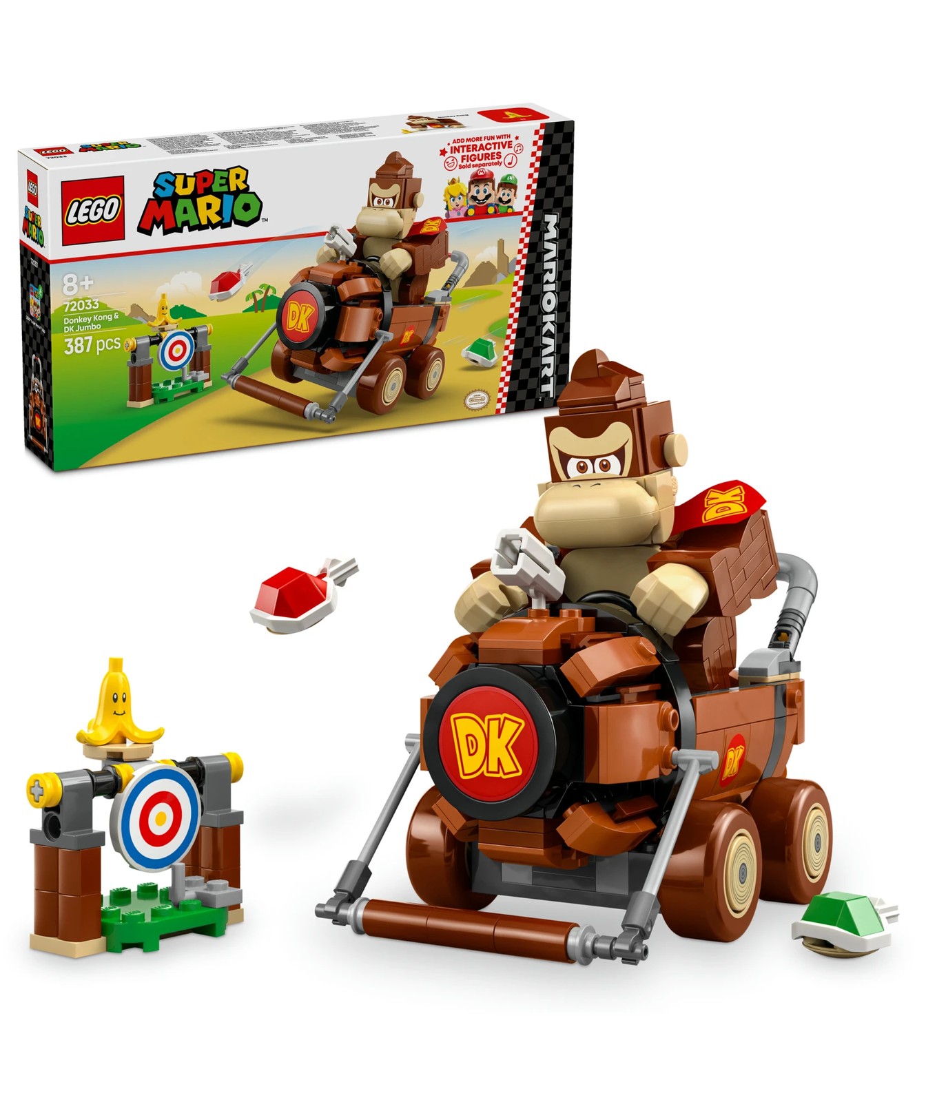 Join Donkey Kong for Mario Kart™ racing adventures with this Nintendo® collectible toy playset for kids (72033). A fantastic LEGO® Super Mario™ birthday gift idea for boys, girls and gamers aged 8 and over, the set features a brick-built DK Jumbo toy vehicle, Donkey Kong toy figure and a target, plus a Banana element with face decoration. Help Donkey Kong drive the DK Jumbo and hit the target by launching shells from the kart to knock the Banana off the top.