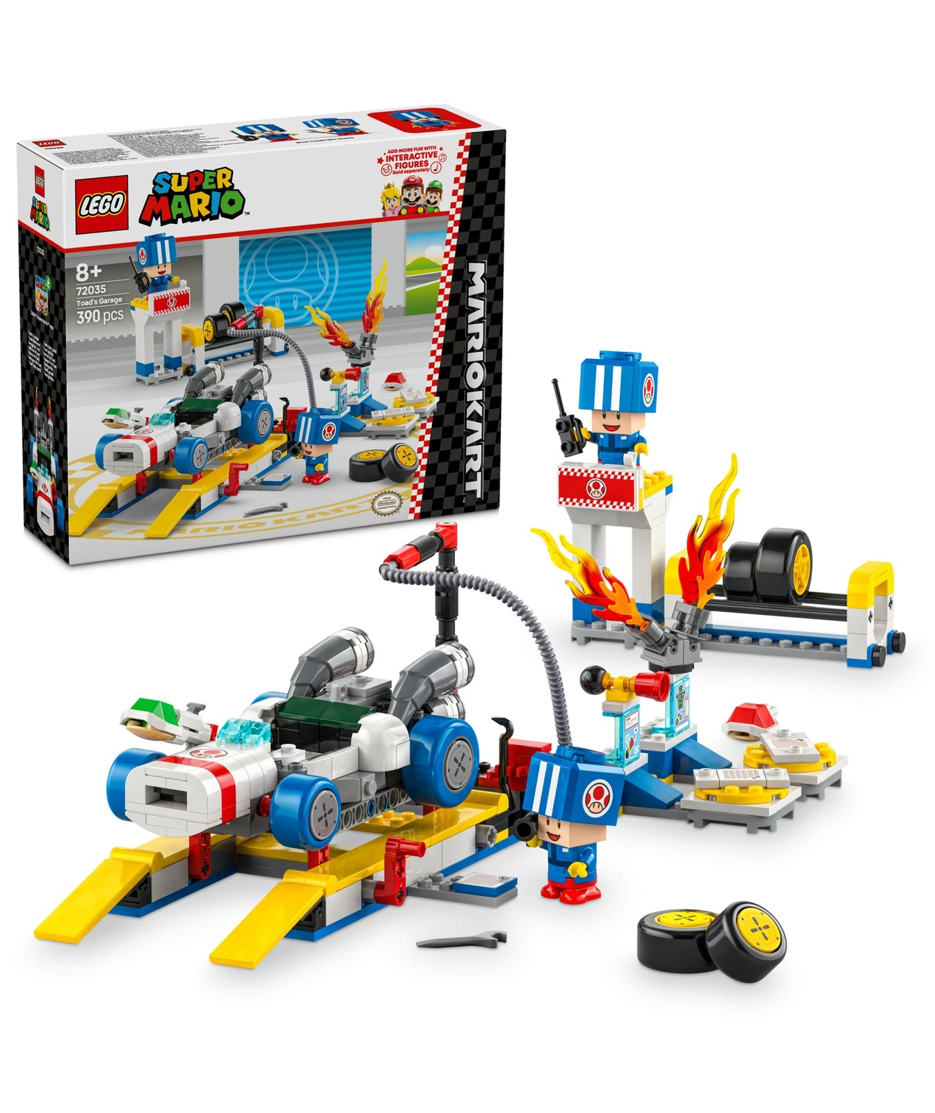 Let kids role-play as pit crew at Toad’s garage and prepare a B Dasher for racing action with this customisable LEGO® Super Mario™: Mario Kart™ toy playset (72035). A fantastic Nintendo® character gift idea for boys, girls and gamers aged 8 and over, the set features 2 Blue Toad toy figures in blue pit crew uniform, plus a working car lift, a choice of Standard Tyres or Blue Standard Tyres and tools. The B Dasher has a shell shooter, and builders can also attach the horn and engine from the Customisation Machines.