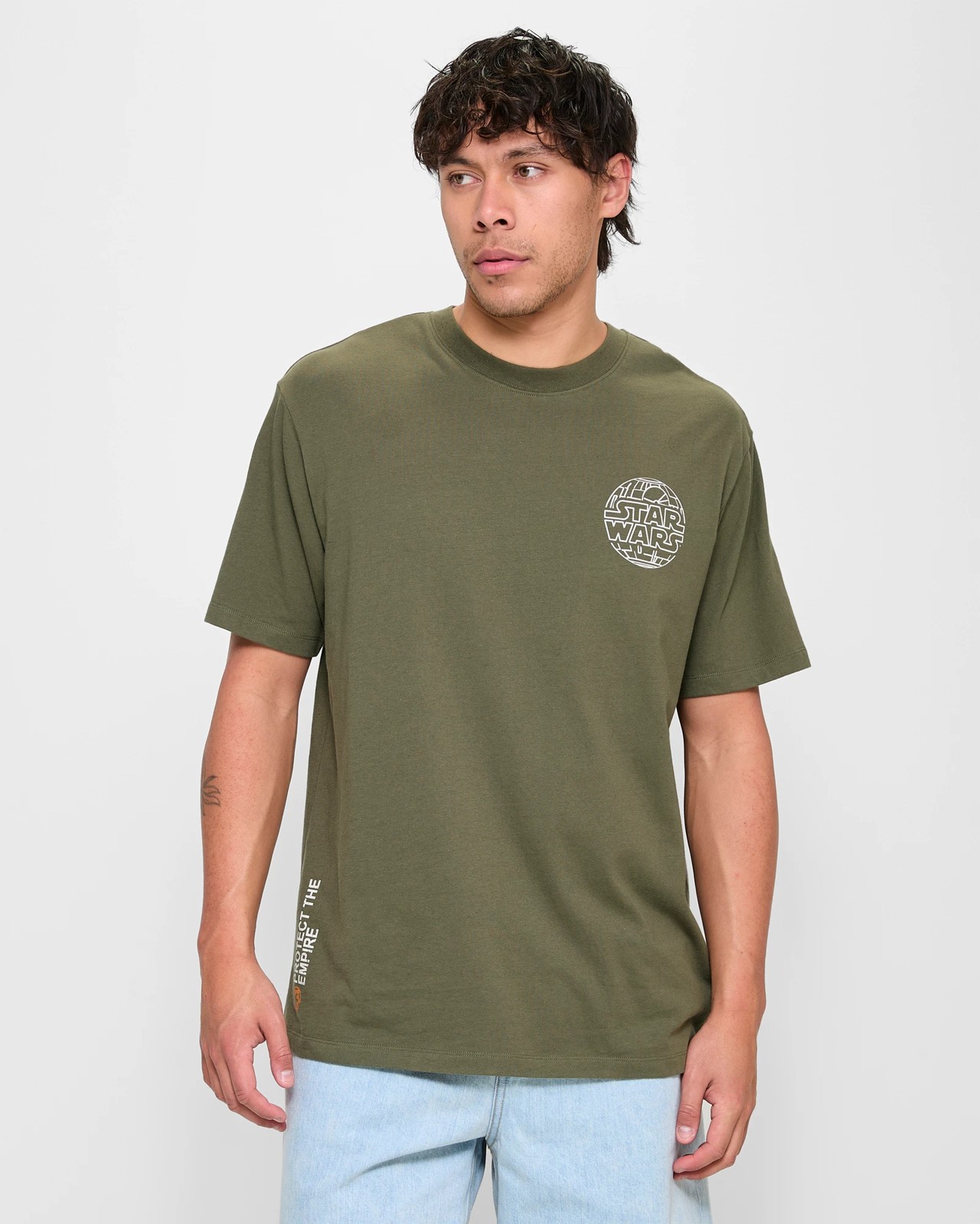 Step into the galaxy far, far away and feel the connection with your favourite saga. This licenced Star Wars™ Death Star T-Shirt is meticulously designed from a soft cotton/polyester blend, offering a comfortable and breathable experience. Its regular fit paired with short sleeves and a crew ribbed neckline ensures you stay relaxed throughout the day. The striking olive green fabric adorned with bold Star Wars™ designs on both the chest and back will surely make you stand out in any crowd. Perfect for every fan, don this tee and showcase your love for the epic franchise. Get yours now and be the envy among friends!
