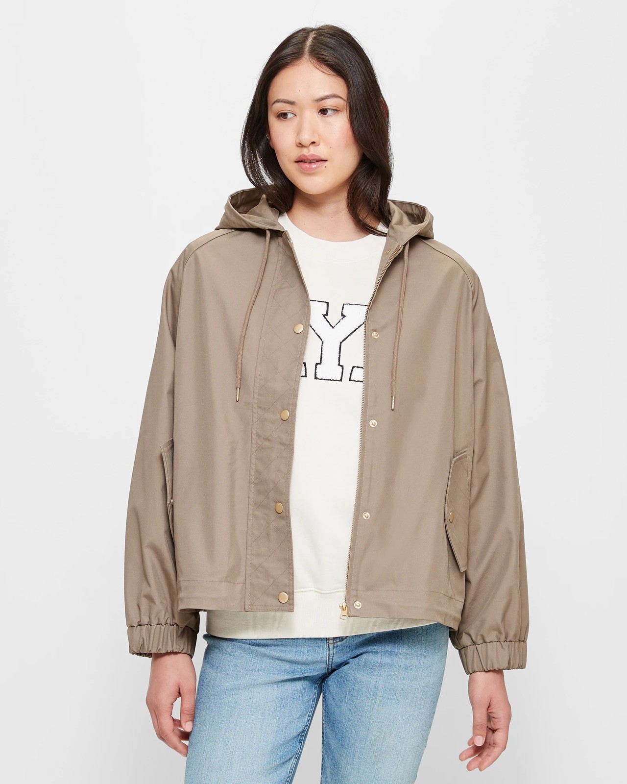 Introducing our lightweight hooded jacket for women. This jacket is made from a blend of high-quality cotton and polyester, ensuring comfort and breathability. It features a regular fit and a round hooded neckline with a drawstring for a custom fit. The long sleeves are thick and elastic cuffed for added warmth and style. The front flap has a quilted look and is secured with push stud closures, while the zip-through front provides convenience. The jacket also has side fold-over pockets with push stud closures, offering both functionality and a trendy look. The straight hemline and inner drawstring add a secure and stylish touch. Upgrade your wardrobe with this stylish and practical jacket today!