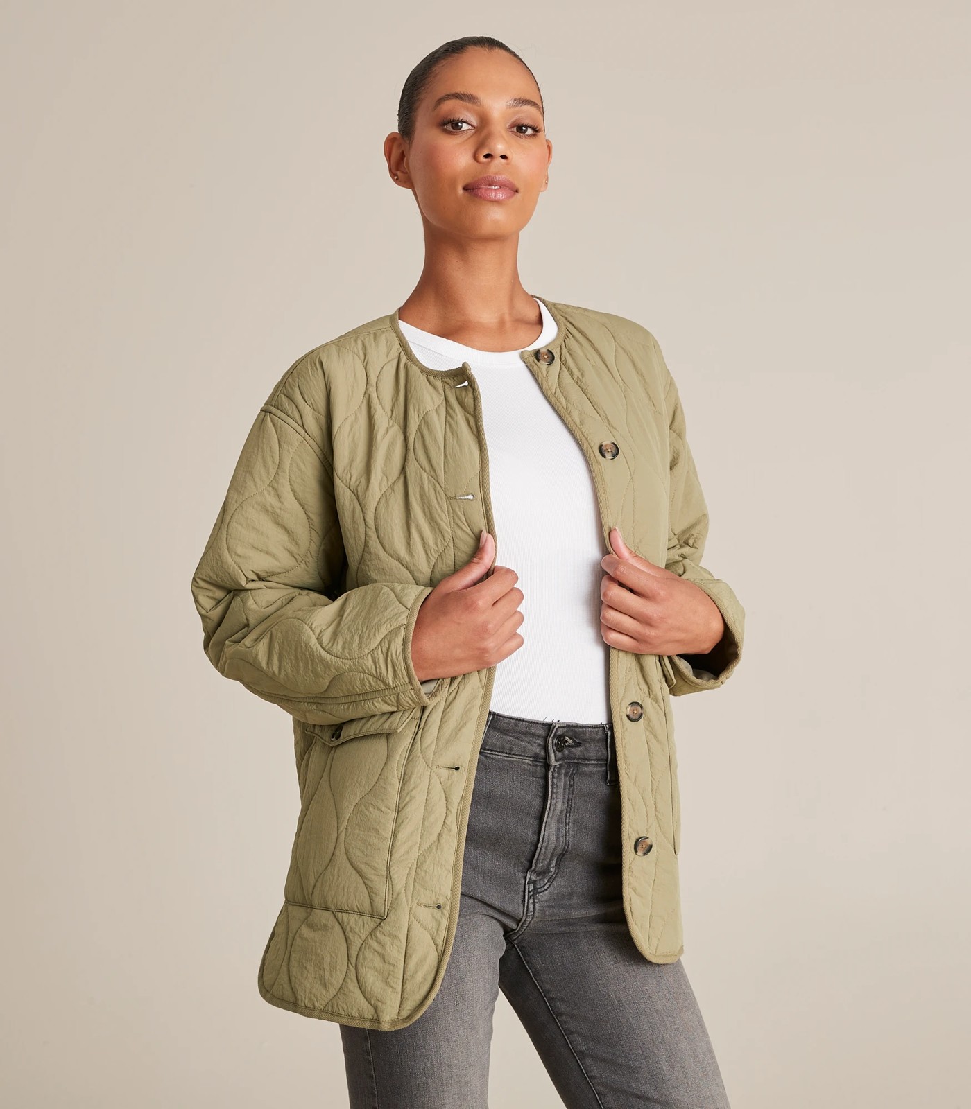 A great coverup for the cooler months, the lightweight puffer jacket features a lightweight puffer design filled with recycled polyester and nylon rich fibres, a button through front and front fold over button closure pockets for all your essentials.