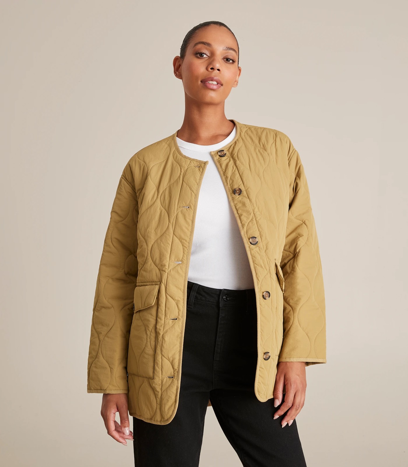 A great coverup for the cooler months, the lightweight puffer jacket features a lightweight puffer design filled with recycled polyester and nylon rich fibres, a button through front and front fold over button closure pockets for all your essentials.