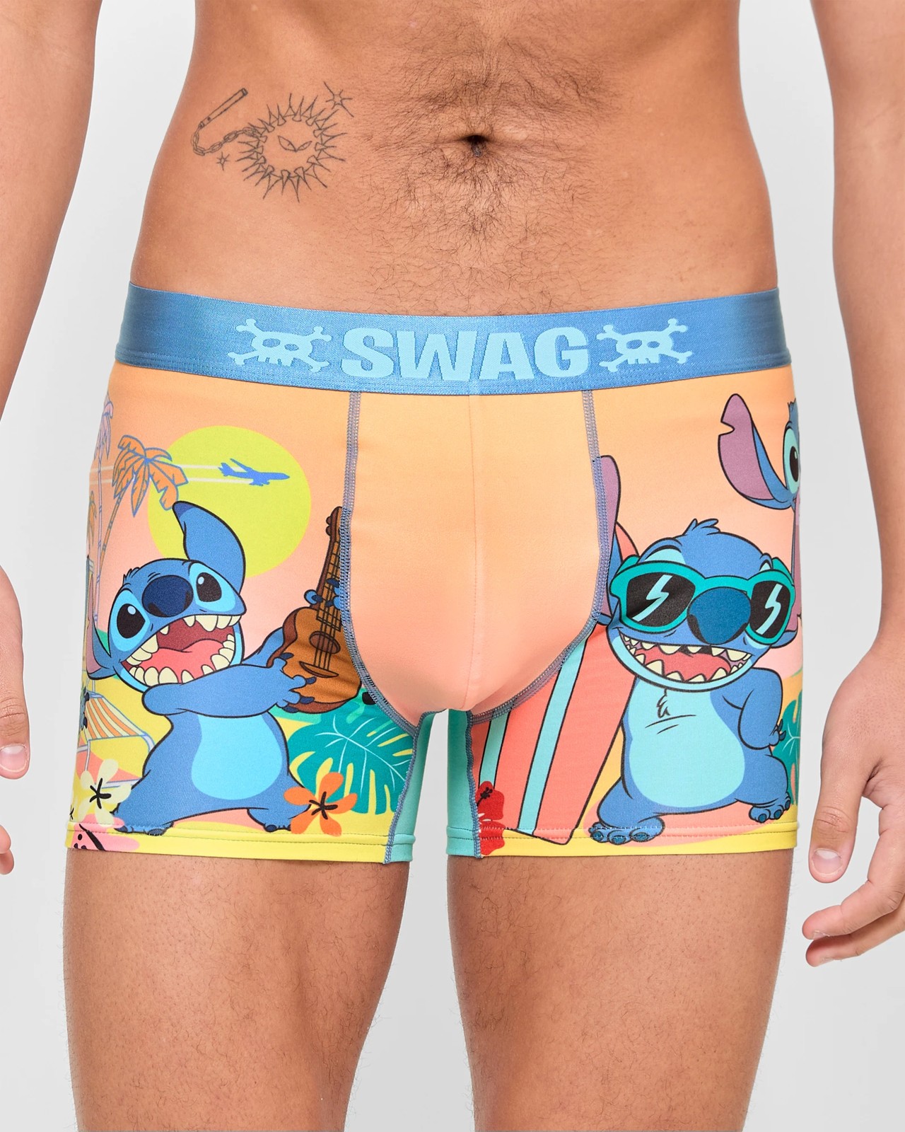 Immerse yourself in the whimsical world of Disney's Lilo and Stitch with our exclusive Swag Trunks. Perfectly blending style with comfort, these trunks showcase a vibrant Lilo and Stitch all-over print that will brighten up your wardrobe. Fabricated from a luxurious micro-polyester blend, they promise stretch for comfort and a silky-soft touch against your skin. The slim-fit design, complemented by a thick ultra-premium satin waistband, ensures a snug fit while accentuating your physique stylishly. Featuring a short leg length and straight hemline for that modern look, these trunks also boast a uniquely contoured pouch for unmatched support. Wrapped in a themed packaging, they make a fantastic gift for any Disney enthusiast or a splendid treat for yourself. Enhance your underwear collection now and dive into the adventure that awaits with every wear.
