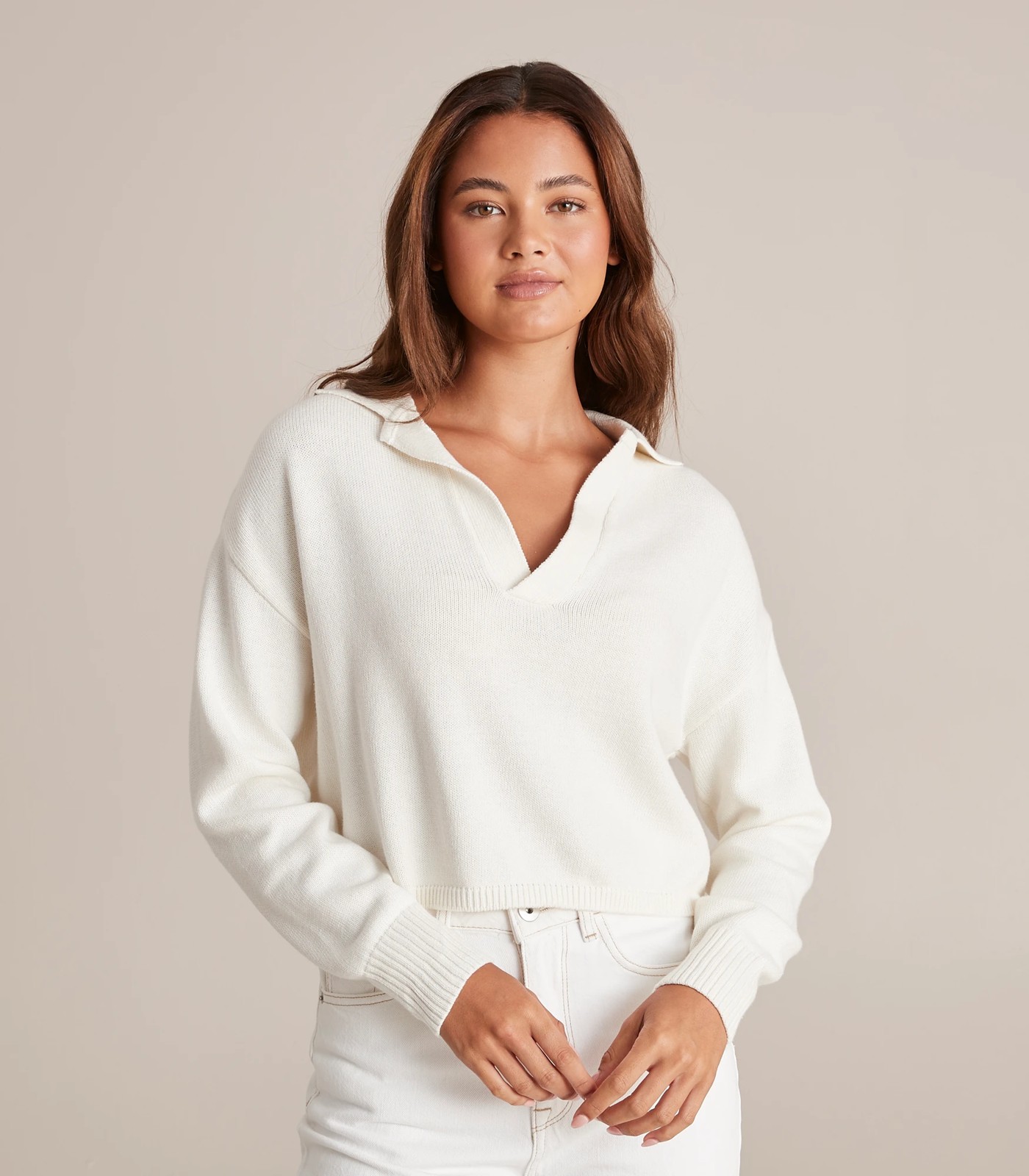 A great throw on with a knit ribbed design that is soft to the touch, the Lily Loves boxy knit polo jumper also features a round collared neckline, long sleeves and a cropped length.