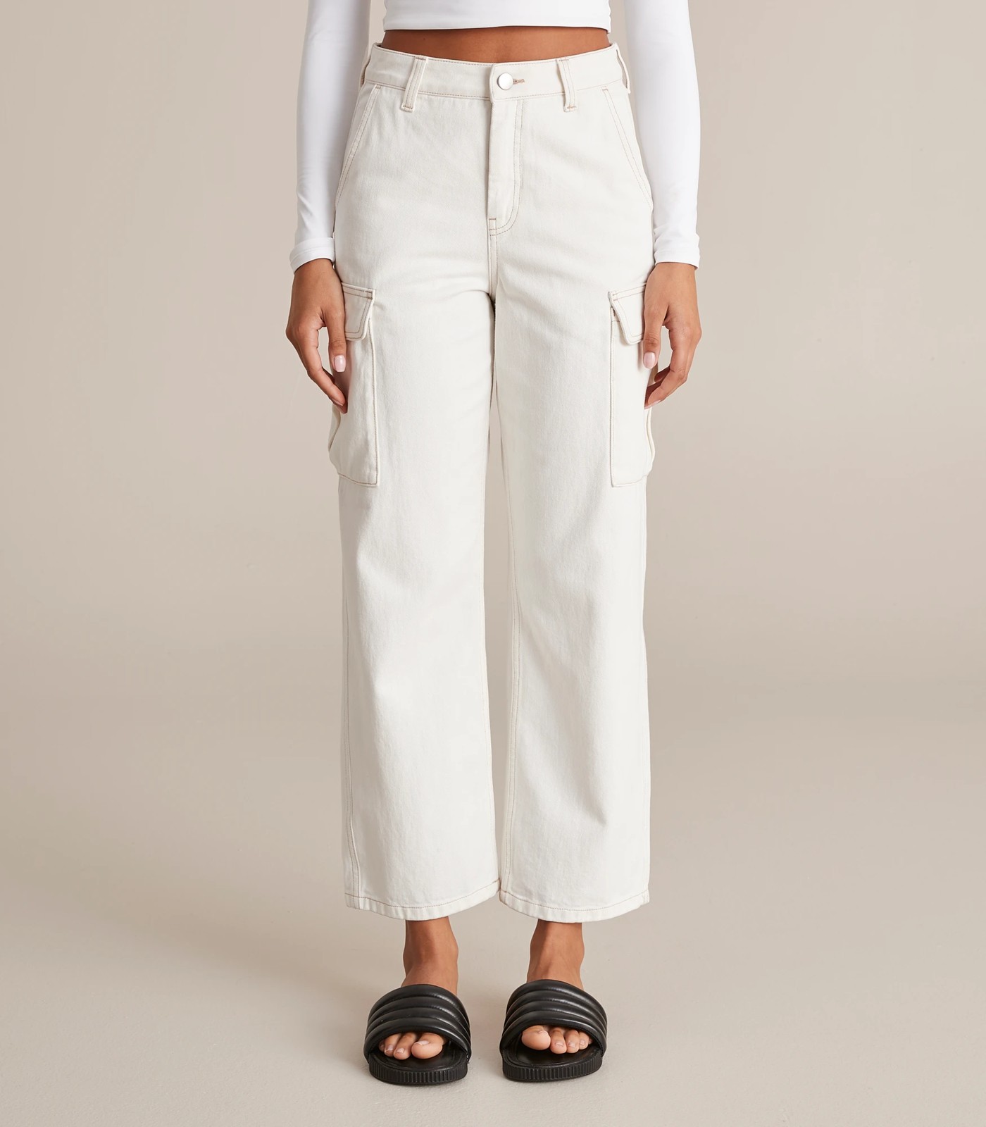 The Lily Loves denim cargo jeans have a high rise fit, are crafted from a breathable cotton denim and have a leg profile that is relaxed through the leg for a flowy effect.