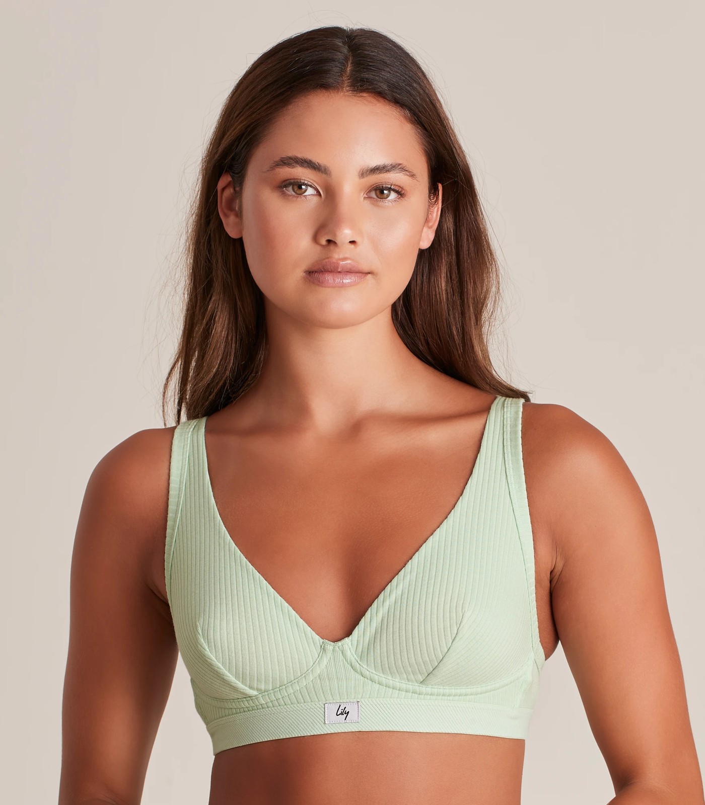 The Lily Loves heritage ribbed bra is comfy and great for everyday wear. It features a thick elastic underbust band with a Lily applique in the centre, an all over ribbed look and a wirefree, plunge design.
