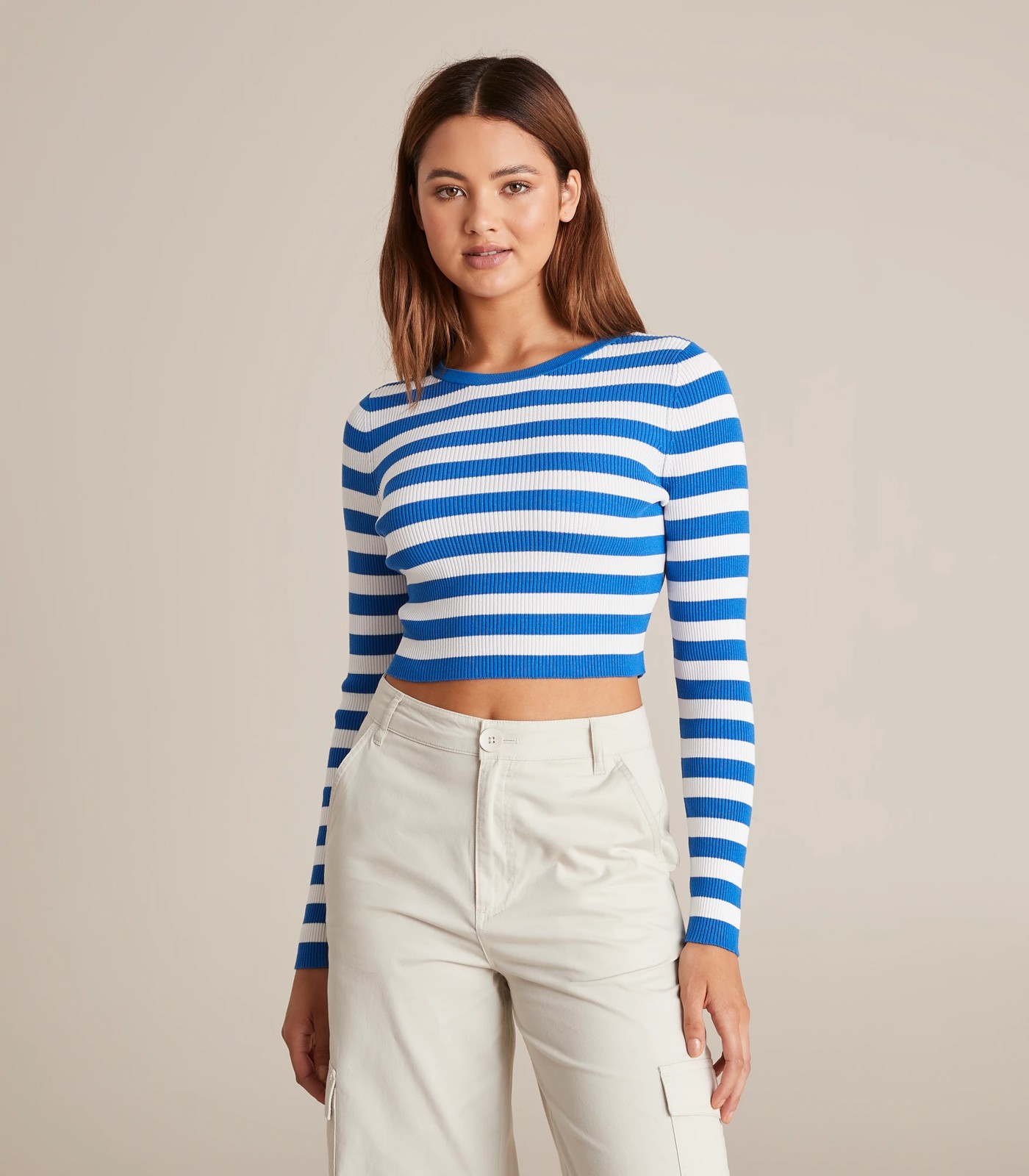 The Lily Loves crew neck crop top is a lightweight knit top with a cropped length, a crew neckline and long sleeves.