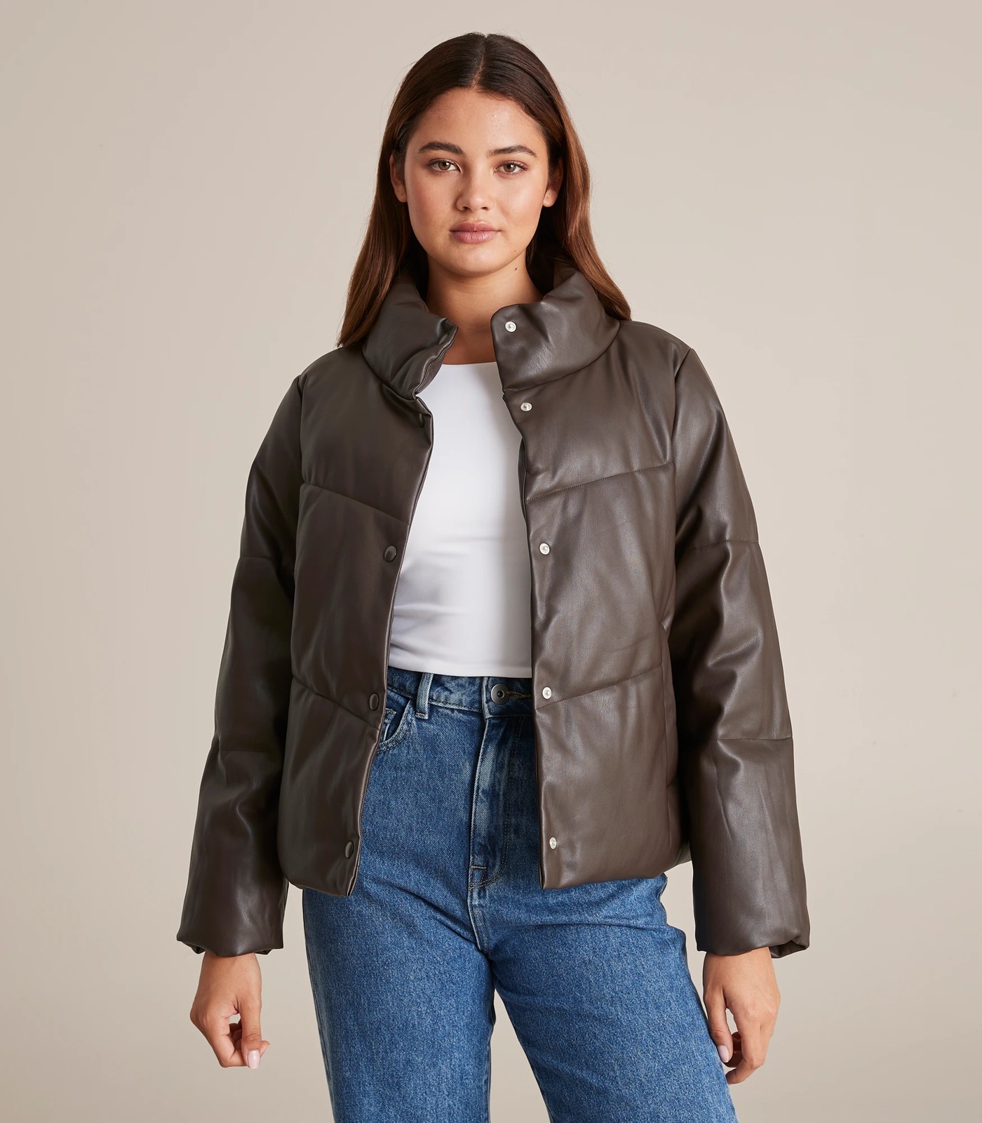 A great coverup for the cooler months, the Lily Loves PU puffer jacket features a thick puffer design filled with polyester rich fibres, a leather look outer, a press stud front closure, long sleeves and a high neckline to keep you covered and warm.