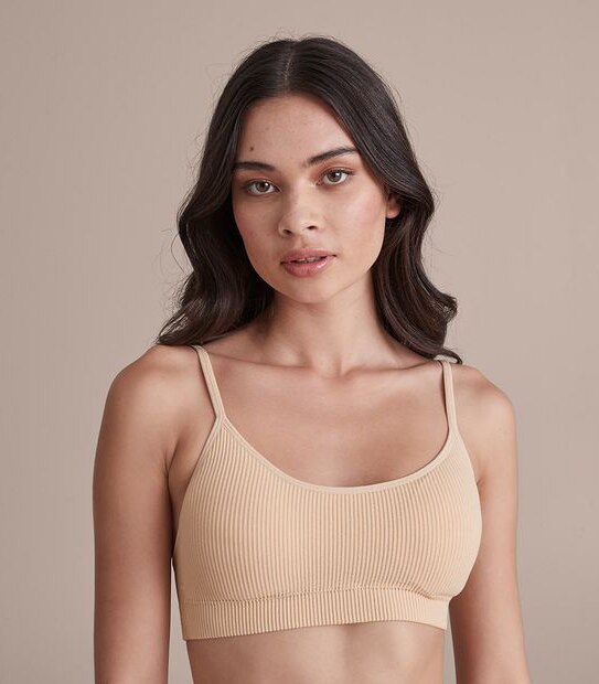 For the woman who loves comfort without the restriction of wire, the Lily Loves ribbed crop bra is wirefree, has adjustable shoulder straps and removable padded cups. Model wears a size 10