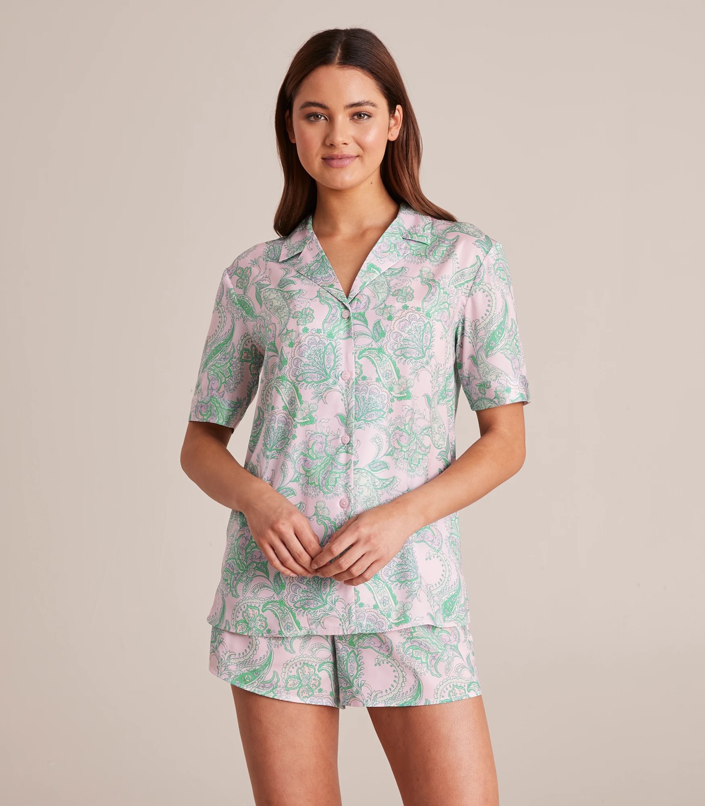 For a great sleep top with a luxe feel, the Lily Loves satin pyjama shirt has a luxe satin feel with a great on-trend print, a collared neckline, button through front for an easy pull on and short sleeves. Pair with the matching pants to complete the set (sold separately).