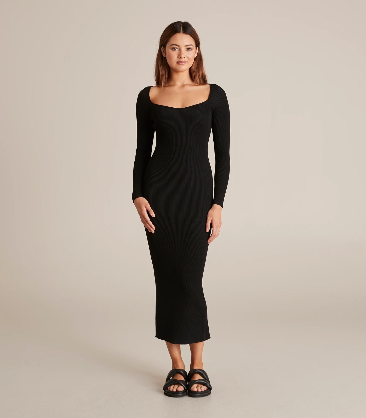 Feel feminine and stand out in the Lily Loves square neck knit midi dress. It features an all over ribbed knit design, a square neckline, long sleeves and a midi length for coverage.