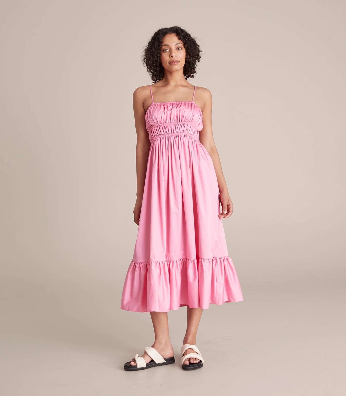 For a lightweight dress that is comfortable and great for the warmer weather, the Lily Loves tiered maxi dress features an elastic pleated bodice, adjustable spaghetti shoulder straps and a maxi length.