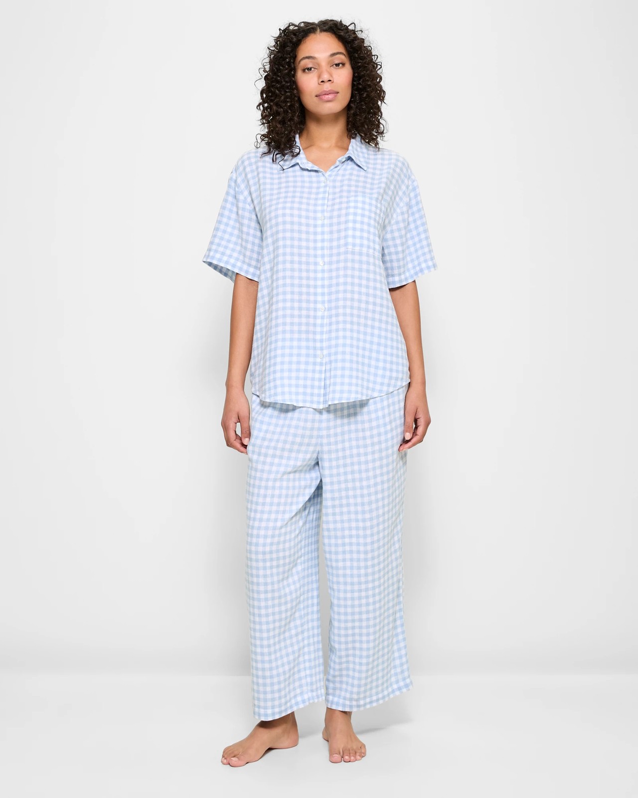 Add a touch of sophistication to your sleepwear with this two piece linen blend sleep pyjama set from Target Woman. The top features a round collared neckline, short sleeves, and button through front. Plus, an open chest pocket and curved hemline complete the look. The bottoms have an elastic waistband, side seam pockets, 7/8 leg length and a straight hemline. Whether you’re lounging around or getting ready for bed, you’ll be sure to stay comfortable and stylish in this chic linen blend sleep pyjama set!