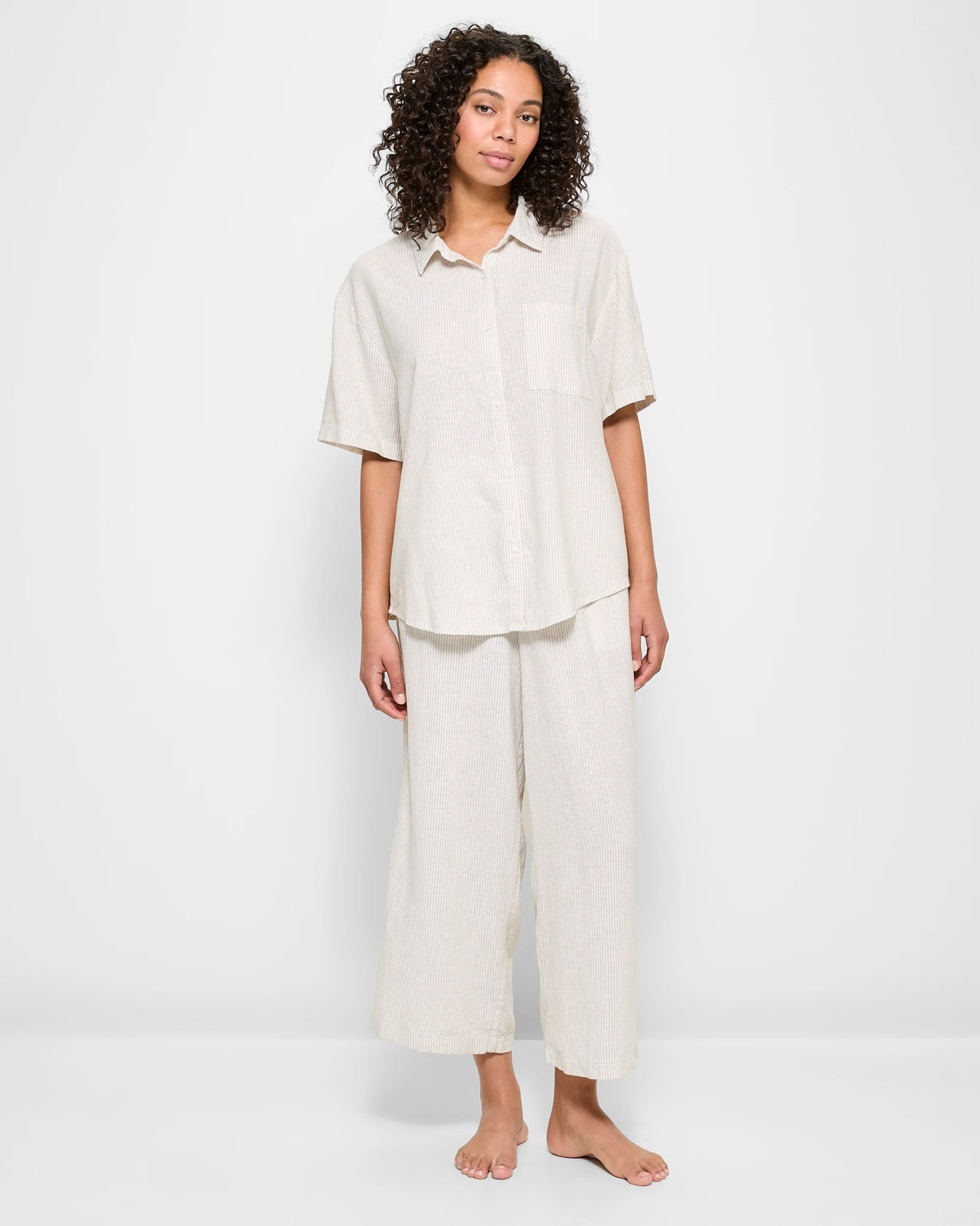 Add a touch of sophistication to your sleepwear with this two piece linen blend sleep pyjama set from Target Woman. The top features a round collared neckline, short sleeves, and button through front. Plus, an open chest pocket and curved hemline complete the look. The bottoms have an elastic waistband, side seam pockets, 7/8 leg length and a straight hemline. Whether you’re lounging around or getting ready for bed, you’ll be sure to stay comfortable and stylish in this chic linen blend sleep pyjama set!