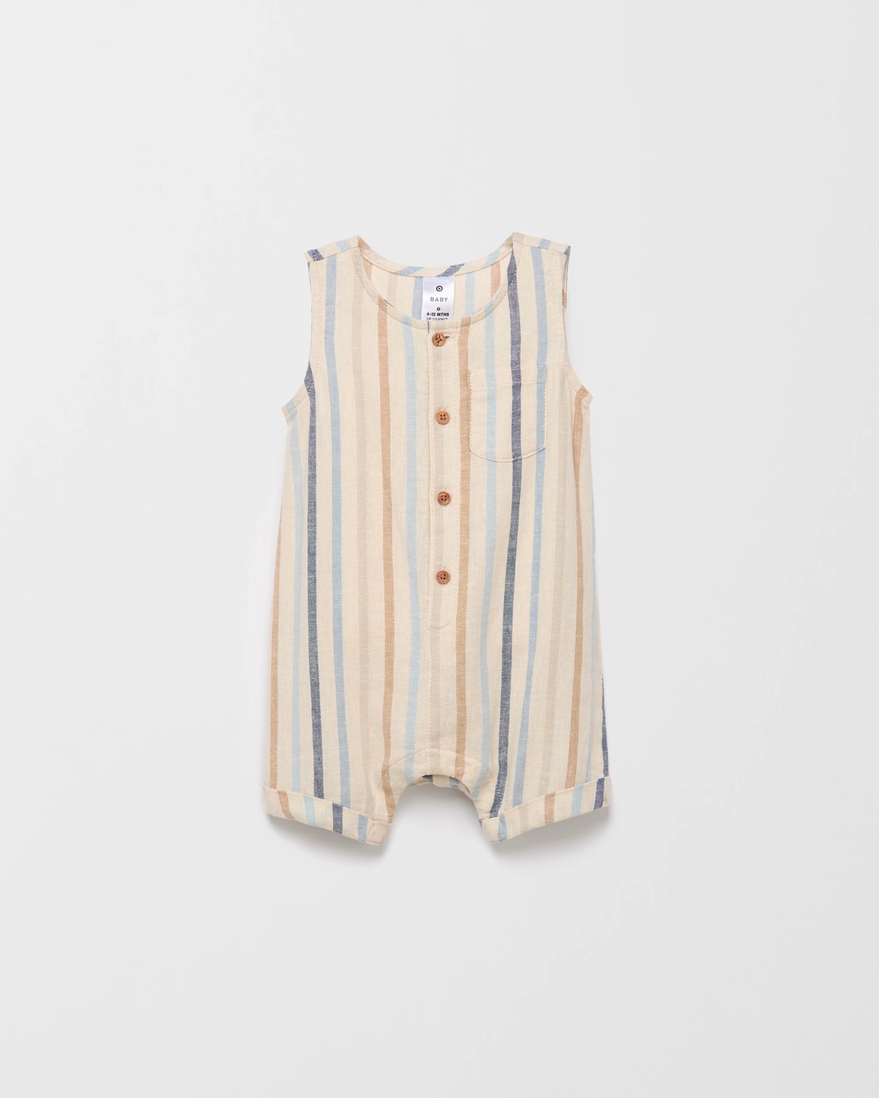 Let your little one enjoy summer days in the perfect blend of comfort and style with this linen blend baby short romper. Using a soft European linen and viscose fabric, this romper feels gentle against sensitive skin and keeps your baby feeling cool all day. Its playful stripe design, sleeveless cut and chest pocket create a charming look that's ready for playtime and outings. Fastening your baby is a breeze thanks to easy front buttons and handy press studs at the crotch, so changes are quick and fuss-free. With a relaxed fit that moves with your baby, this romper suits busy crawlers and cosy nappers alike. Add fun and ease to your baby's wardrobe—treat them to this delightful romper and brighten up your everyday adventures.
