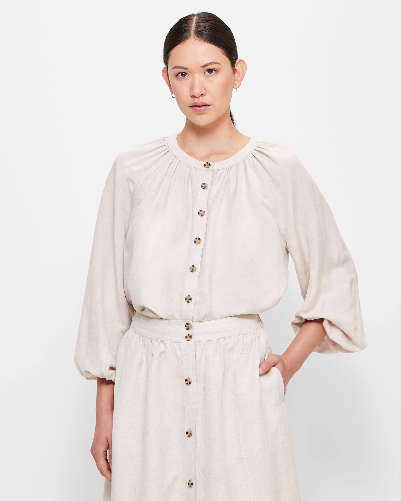 Introducing our stunning Linen Blend Balloon Sleeve Blouse from Preview. This blouse is made from a lightweight and breathable linen/viscose blend, ensuring all-day comfort. The regular fit and round neckline with gathering create a flattering silhouette. The button through front adds a touch of elegance, while the long balloon sleeves with elastic cuffs give a chic and stylish vibe. The curved hemline adds a modern twist. Whether you're heading to the office or a coffee date, this blouse is the perfect choice. Update your wardrobe today and enjoy the comfort and style of our Linen Blend Balloon Sleeve Blouse from Preview!