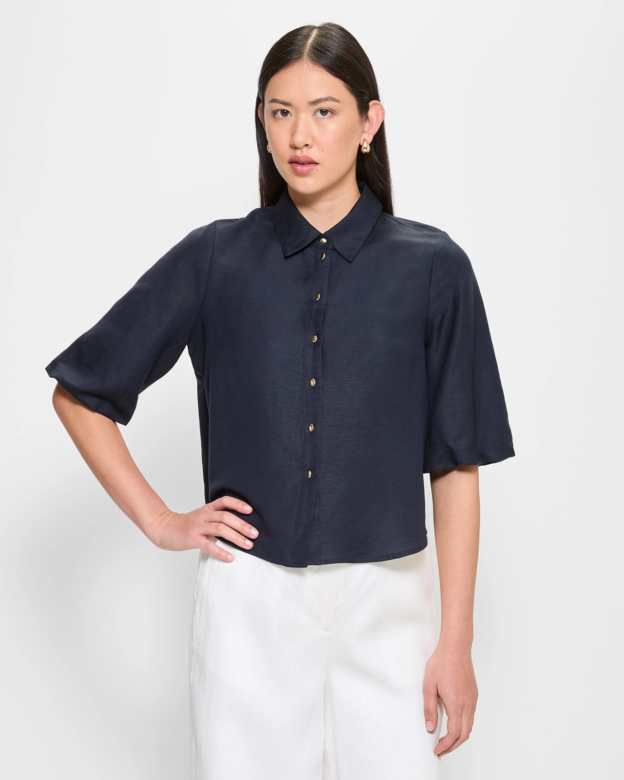 Refresh your wardrobe with our Linen Blend Balloon Sleeve Blouse. Made from a soft linen and viscose mix, this blouse offers a breezy and comfortable feel, perfect for any day. The cotton sleeve lining ensures added comfort, while the regular fit provides an easy wear. Featuring a round collared neckline and charming oval button front, this blouse combines style and ease. The short balloon sleeves with inner elastic cuffs add a playful touch, and the curved hemline makes it great for pairing with your favourite pieces. Bring ease and charm to your outfit with this must-have blouse.