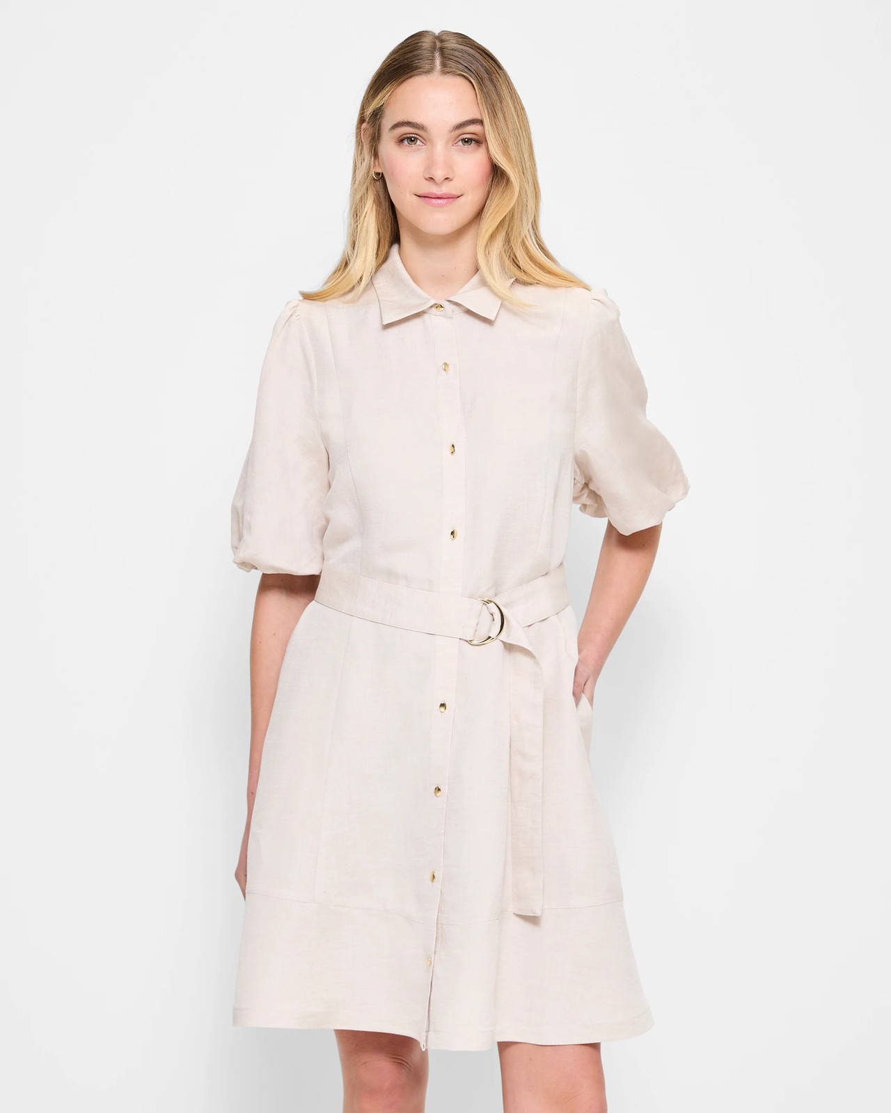 Step into effortless style with our Linen Blend Balloon Sleeve Mini Dress. Made from a luxurious linen and viscose blend, this dress ensures comfort with its light and breathable fabric. Featuring a classic round neckline and chic short balloon sleeves with elastic cuffs for a cosy fit, this mini dress also includes a removable buckle closure belt to adjust the waist as you like. With a straight hemline and vertical panelling for a well-structured look, it's perfect for any occasion. Enhance your wardrobe with this blend of comfort and chic fashion. Try it today!