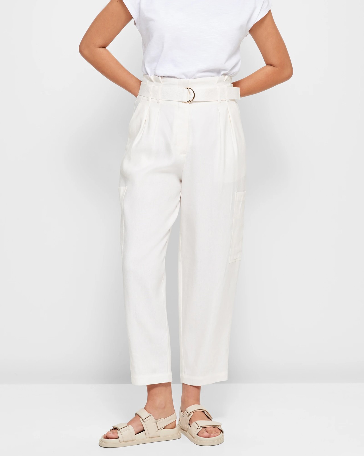 Elevate your wardrobe with these Linen Blend Belted High Waist Pants. Crafted from a luxurious linen/viscose blend, these pants offer a stylish and comfortable fit. The whisper white colour adds a touch of elegance, while the high-waisted design flatters your figure. The structured front pleat waistband features belt loops, allowing you to accessorise with the removable woven d-ring belt for a personalised look. Front pockets and large side thigh open pockets provide convenient storage. With a crop length and elastic back waistband, these pants are perfect for both casual outings and formal occasions. Make a statement with these versatile and chic pants and seize the day!
