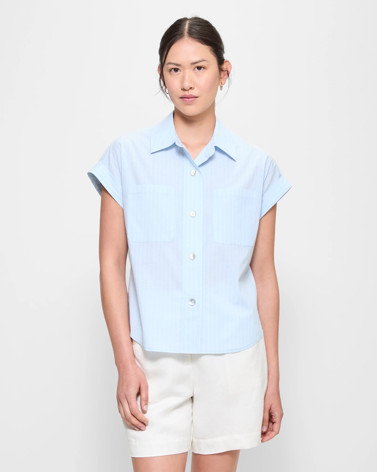 Step into style with our Linen Blend Crop Shirt featuring a cotton and linen mix designed for ultimate comfort and airflow. The stretch elastane ensures a comfortable fit, while the round collared neckline and button-through front add a classic touch. With short roll cuff sleeves and open chest pockets, this shirt offers both functionality and a chic look. Perfect for a casual outing or a relaxed professional setting, this crop-length shirt is your go-to choice. Don't miss out on this stylish wardrobe staple - enhance your look now!